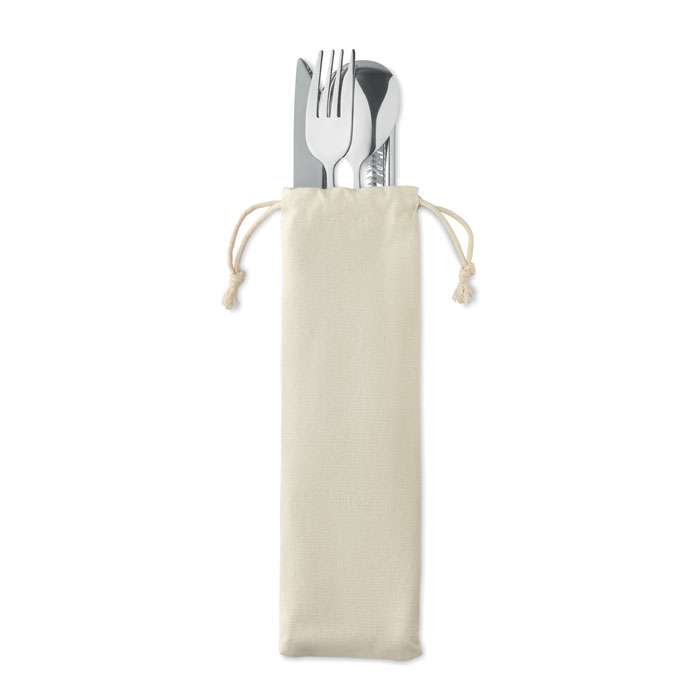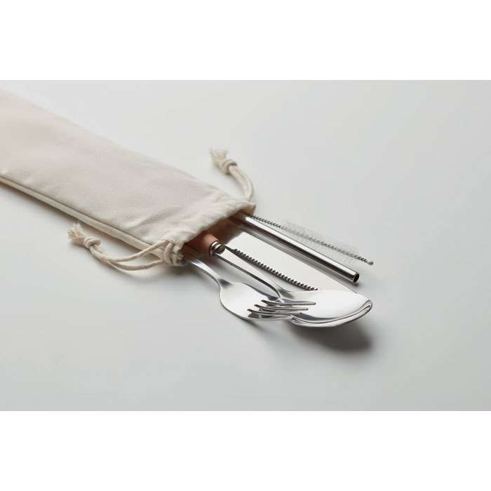 Flergångs bestickset i rostfritt stål med handtag i bokträ. Eftersom dessa levereras i en liten canvaspåse kan du enkelt ta med dig det för att äta en lunch i bilen eller ha med i ryggsäcken på fritiden.