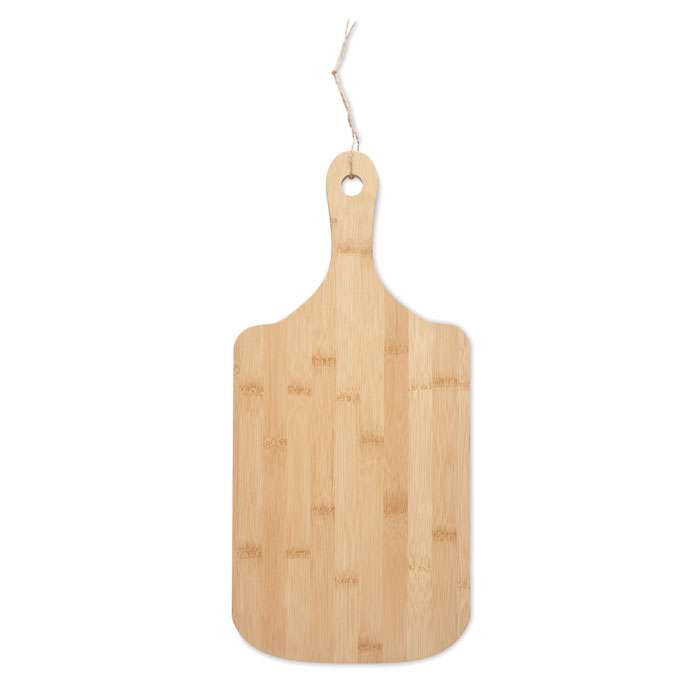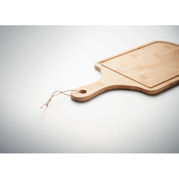 Serveringsbräda/skärbräda i bambu med fräst spår fär vätska och juterep.