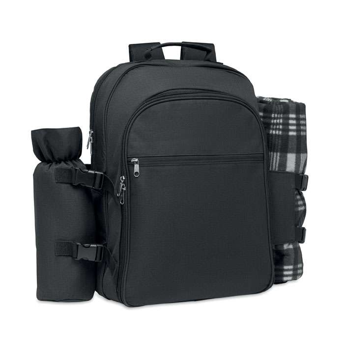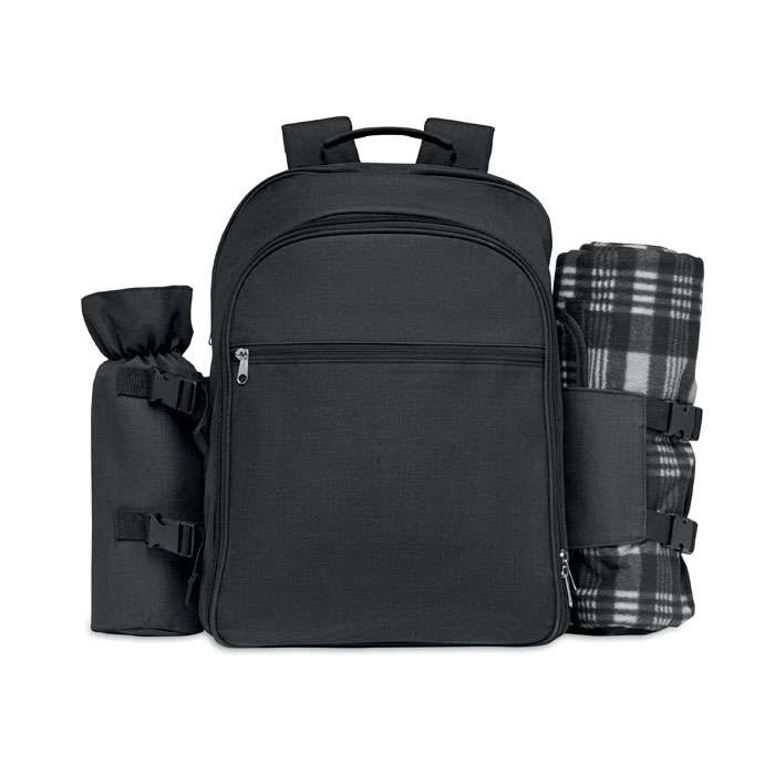 Picknickryggsäck i 300D RPET polyester för 4 personer med kylfack med högkvalitativa bestick, 1 servitörs korkskruv, skärbräda, brödkniv och picknickfilt. Väska i kationiskt 2-färgad polyester.
