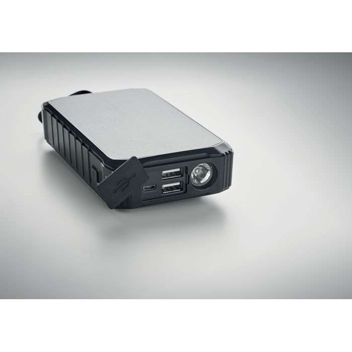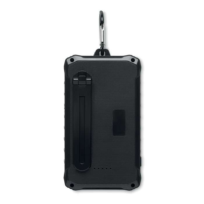 Powerbank 8000 mAh med dynamo med handvev. och solcell. Innehåller 1 LED-lampa med 100 lumen. Typ C-ingång/utgång, 2 USB-A-utgångar. Utgångsström DC 5V/2,1A.