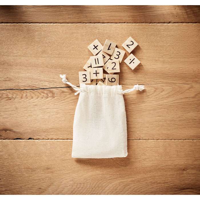 Pedagogiskt räkne spel i trä. Kul sätt att lära barn i olika åldrar att bekanta sig med siffror på ett lekfullt sätt. Kommer med bomullspåse. Innehåller 32 bitar.