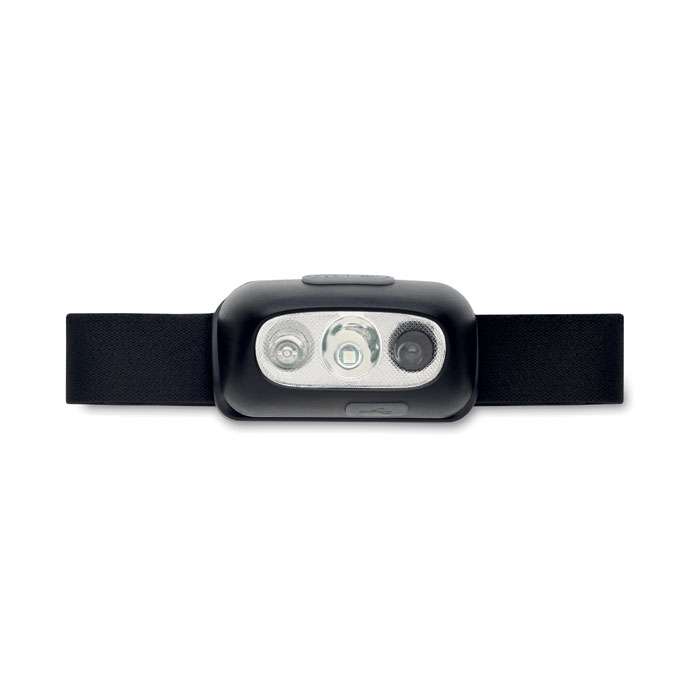 Uppladdningsbar och justerbar pannlampa med 1 LED-lampa (50 lumen) och 3 blixtlägen. Inbyggt uppladdningsbart batteri på 400 mAh och medföljande laddningskabel.
