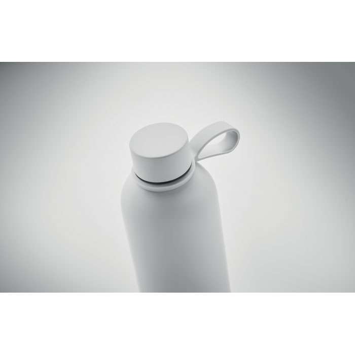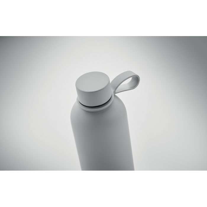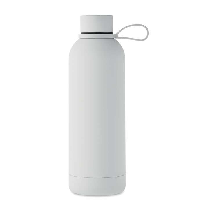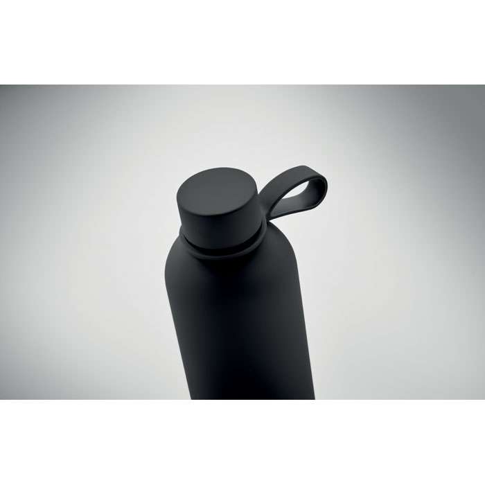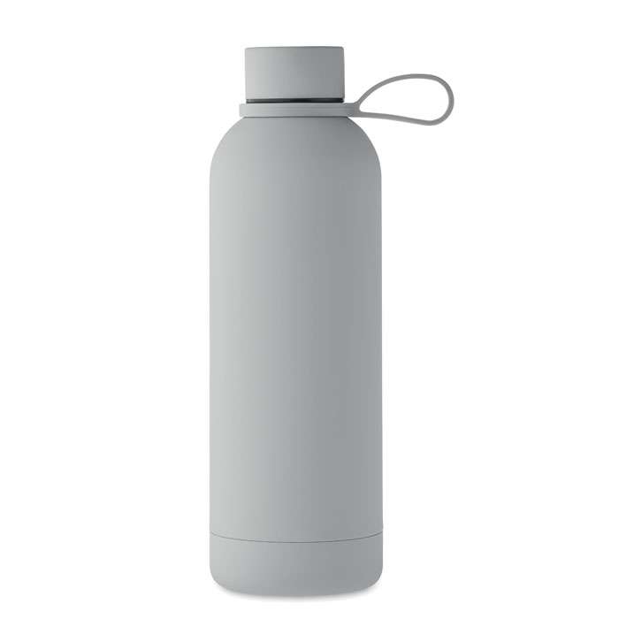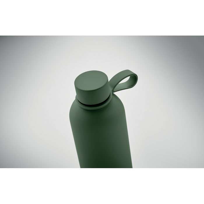 Dubbelväggig vakuumisolerande flaska i återvunnet rostfritt stål (90% återvunnet rostfritt stål och 10% rostfritt stål) med gummifinish och silikonhandtag. Volym: 500 ml.