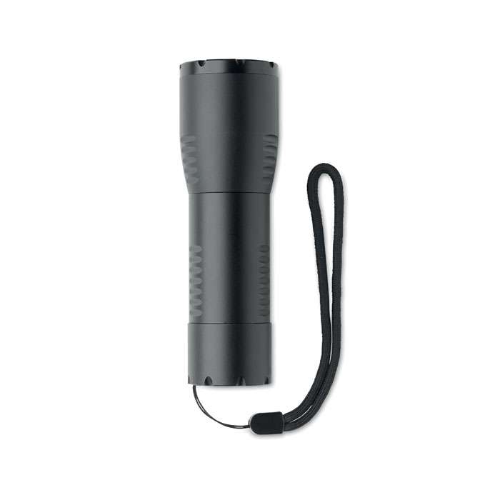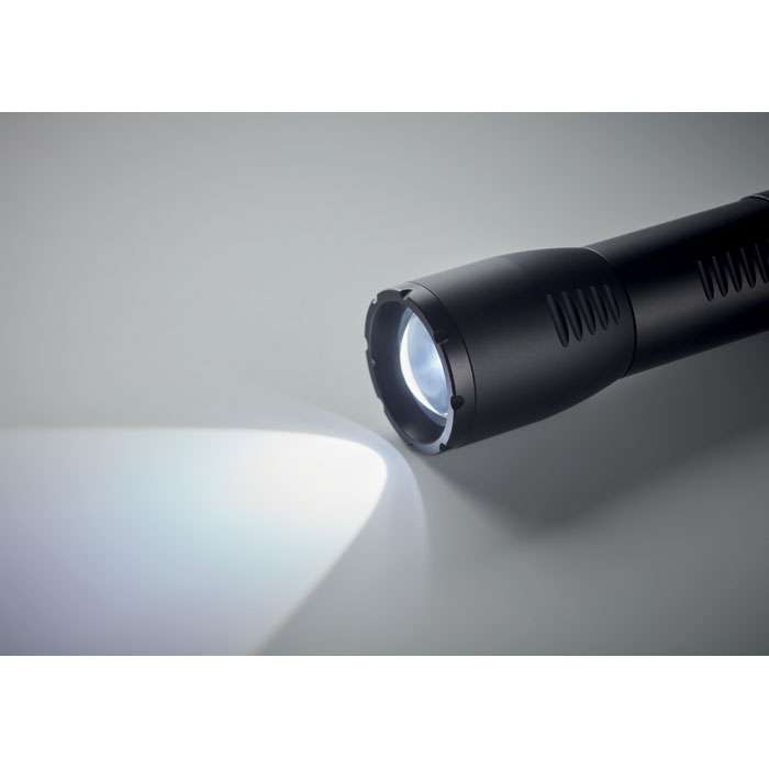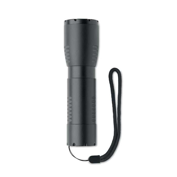 Liten LED-ficklampa i aluminium med zoombar ljuskälla och avtagbar rem. Uteffekt: 200 lumen. 3 AA-batterier, ingår inte.