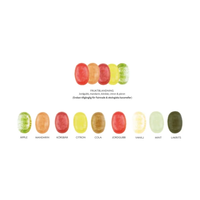 | Smak | Äpple, Citron, Cola, Fruktblandning, Jordgubb, Körsbär, Lakrits, Mandarin, Mint, Vanilj |
