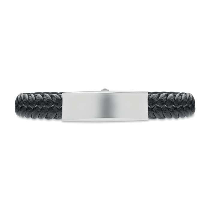 Armband med flätad manschett i konstläder och beslag i polerat stål. Spänne med trycklås. Handledens omkrets: 21 cm.