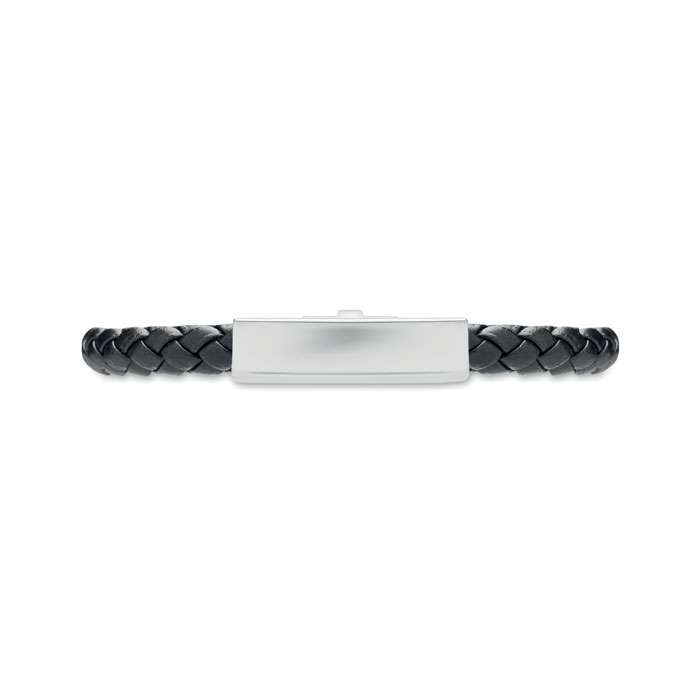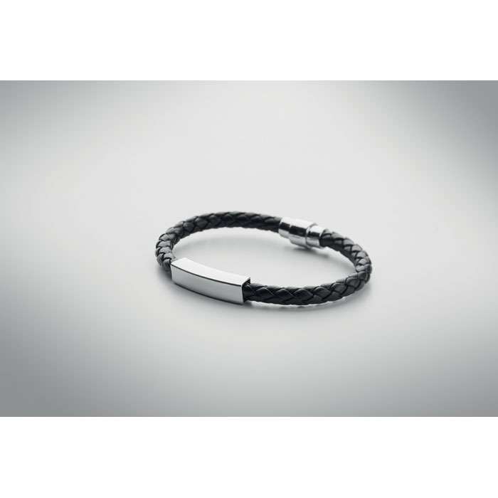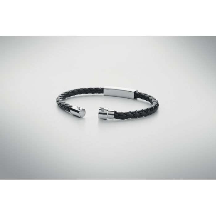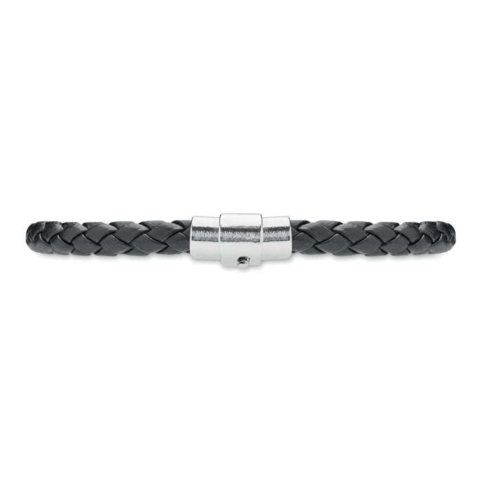 Armband med flätad band i konstläder och beslag i polerat stål. Trycklåsspänne. Omkrets på handleden: 19 cm.