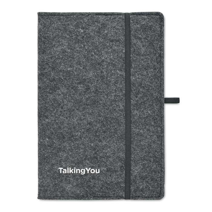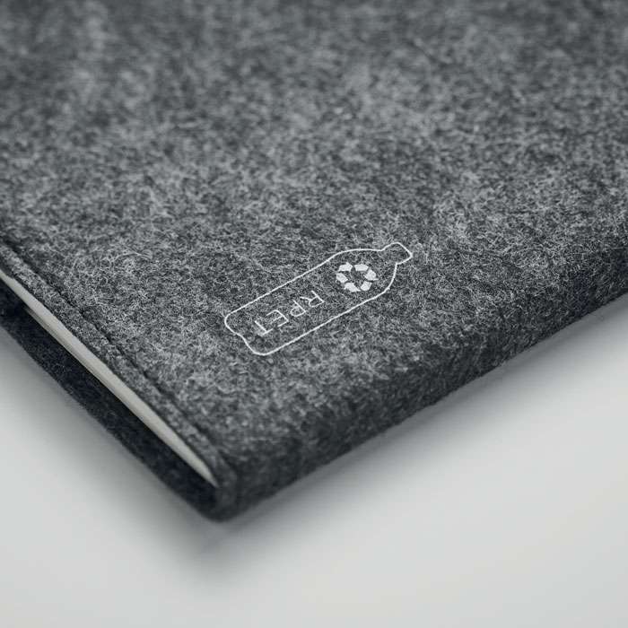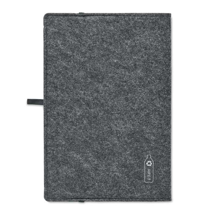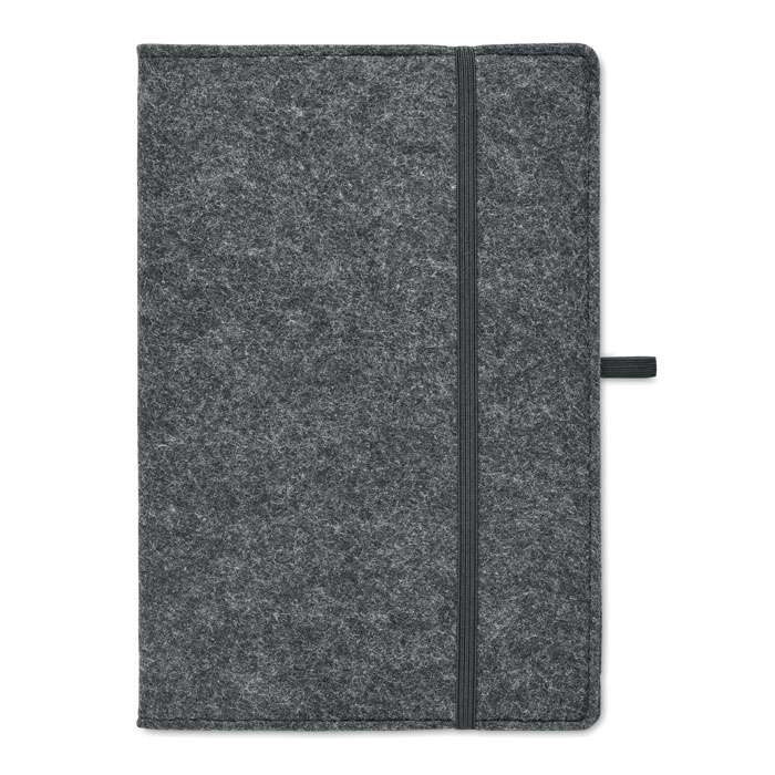 A5 anteckingsbok med RPET-filtomslag. 160 linjerade sidor i återvunnet papper (80 ark / 70 gr/m²). Pennhållare.