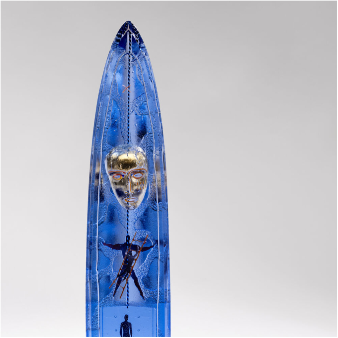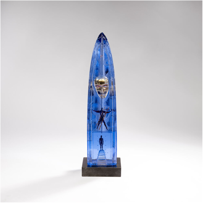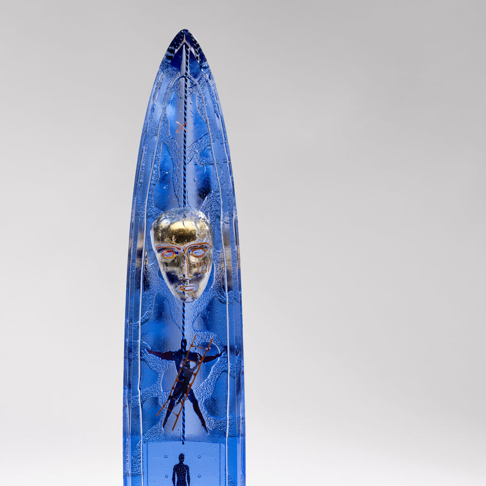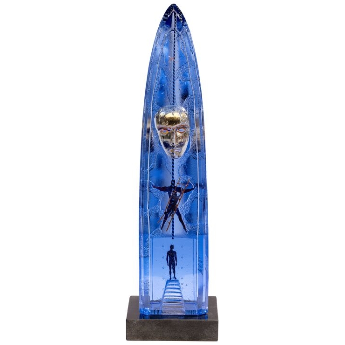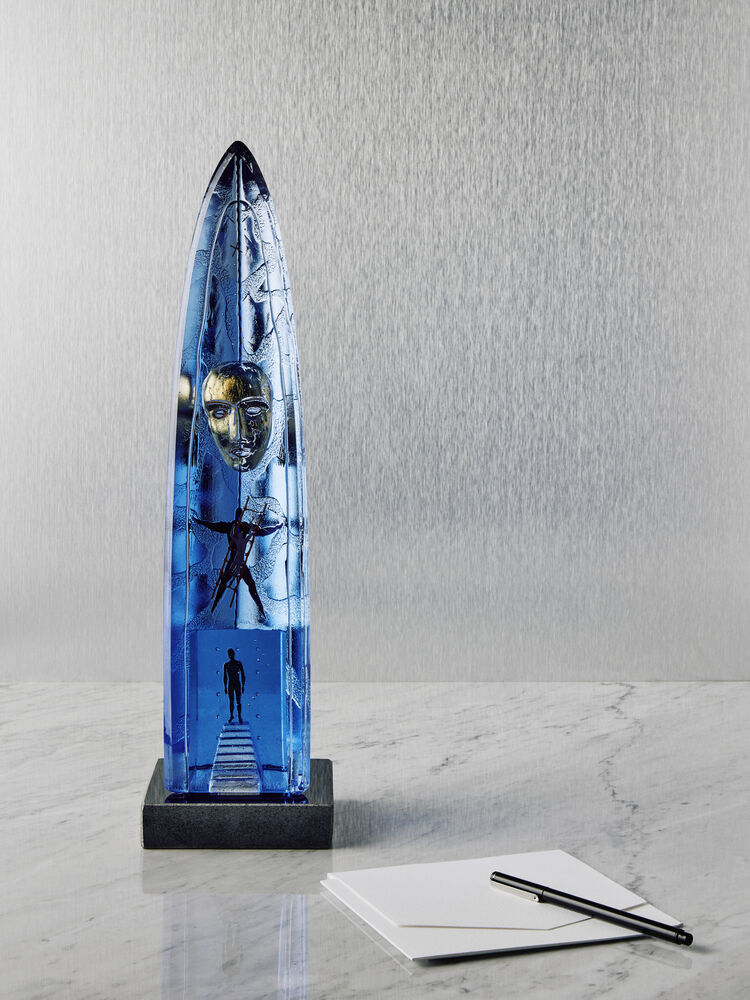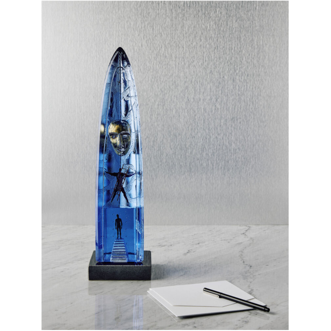 Bertil Valliens klassiska vertikala farkost First Step i “Vallien blå” med ett huvud handmålat i guld, är gjuten på Kosta Glasbruk i en upplaga om 300 exemplar, signerade av konstnären. First Step står stolt på en svart sockel av sten.