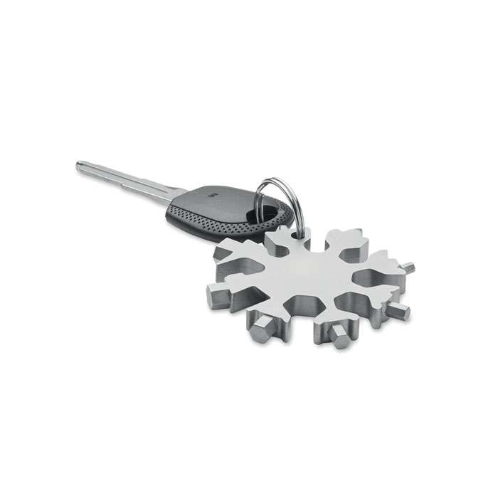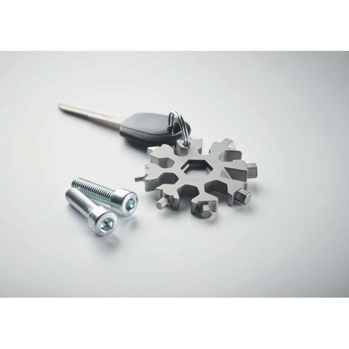 Multiverktyg utformad som snöflinga i rostfritt stål med 17-i-1 funktion och metallring.