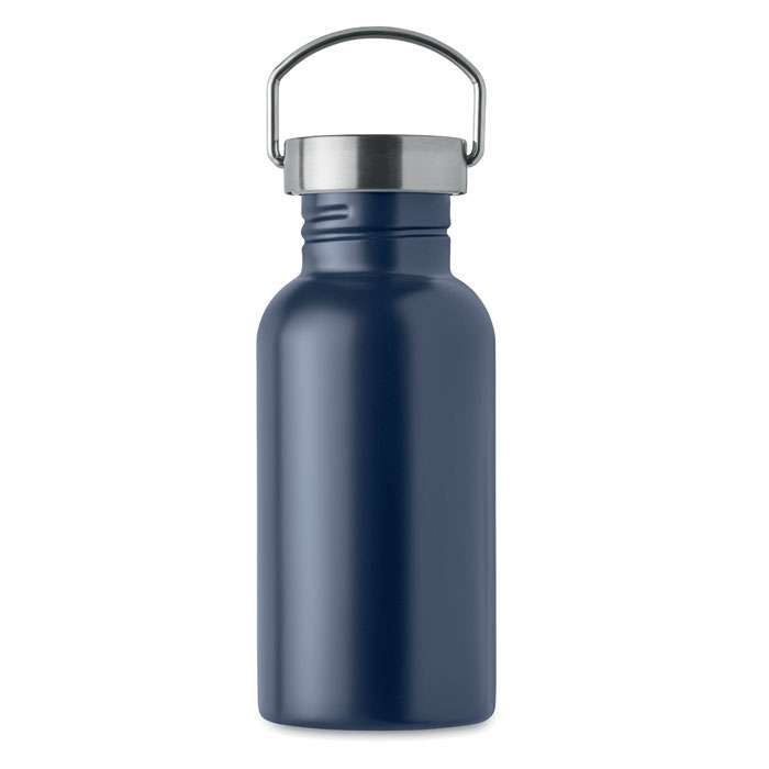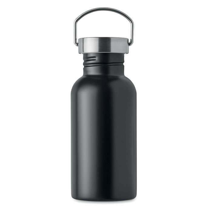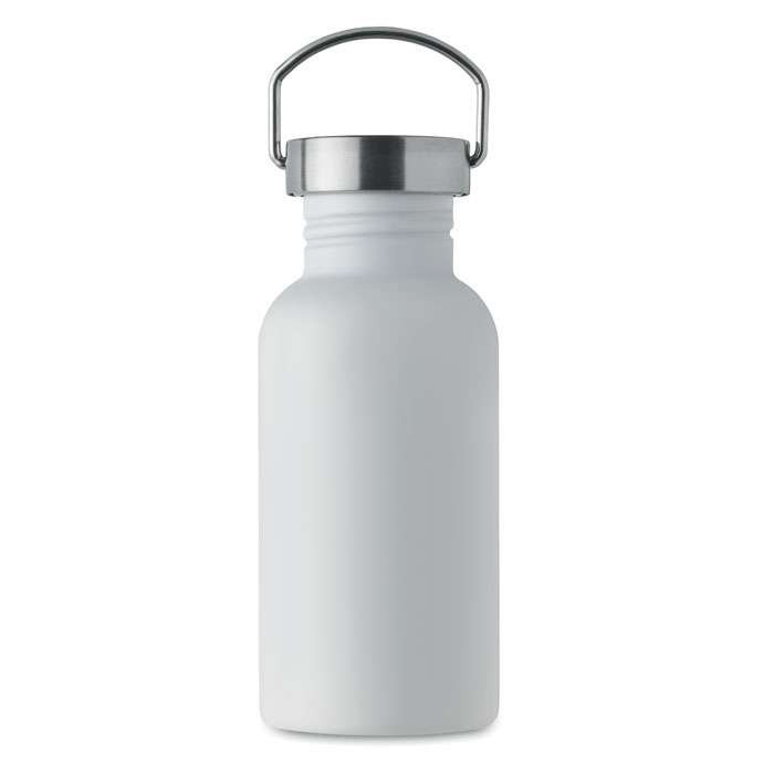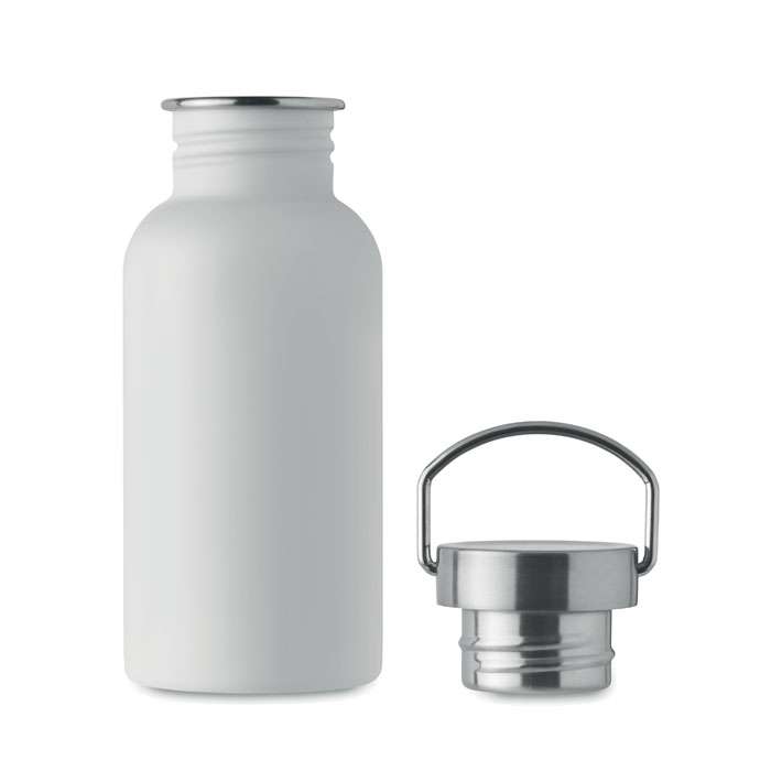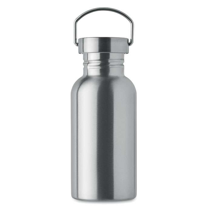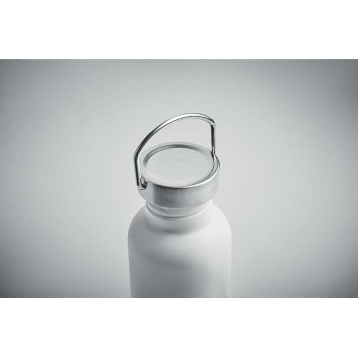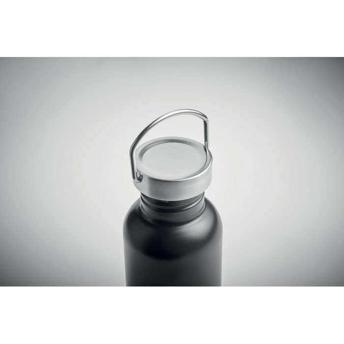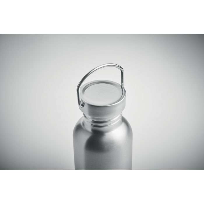 Enkelvägg flaska i återvunnet rostfritt stål (90 % återvunnet rostfritt stål och 10 % rostfritt stål) Lock med handtag. Läckagefri. Volym: 500 ml. Silikongreppet ger dig ett bra grepp och skyddar dina händer från att bränna sig.