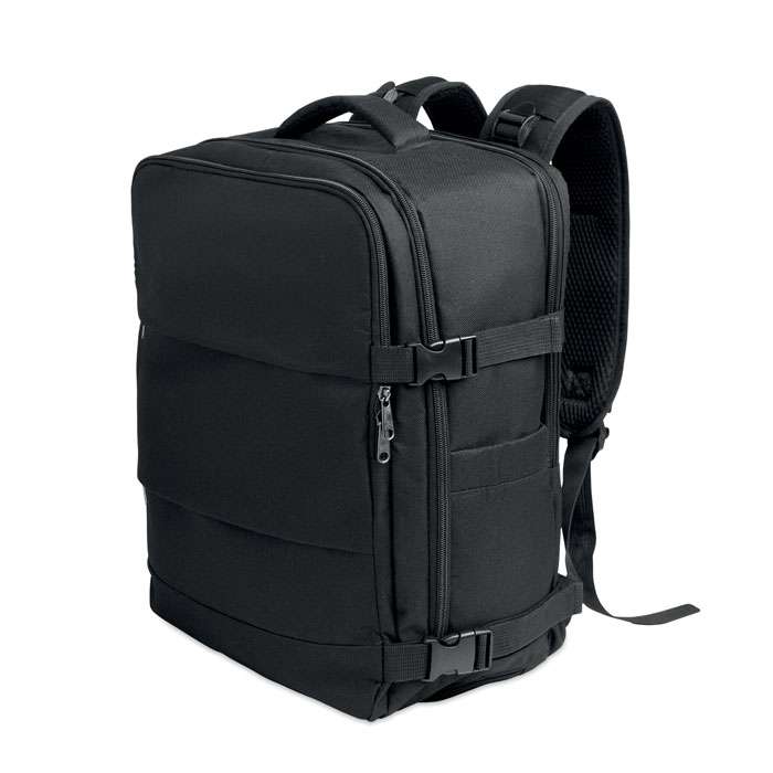 Expanderbar ryggsäck i kabinstorlek i 600D RPET-polyester med PU-baksida och 180°-öppning. Inklusive skoförvaring, vadderad 15” laptopficka, meshfickor, bagagerem och sidospännen.