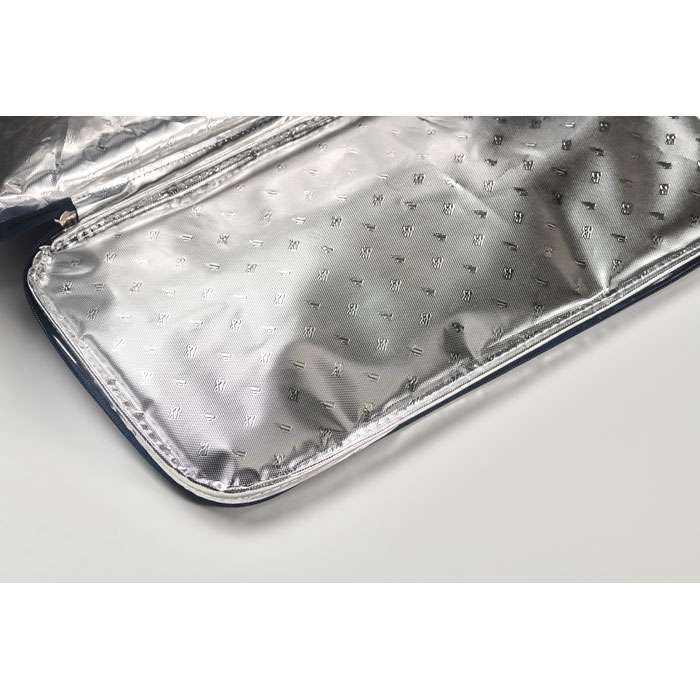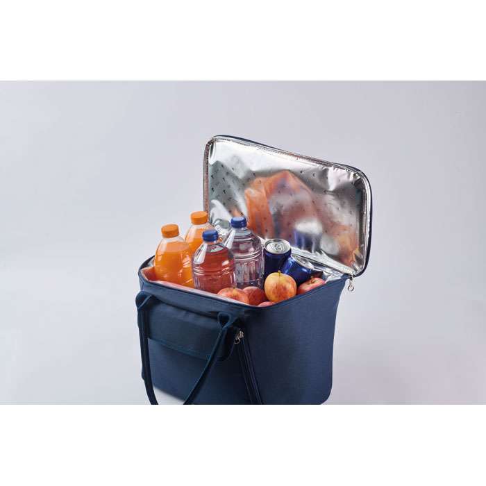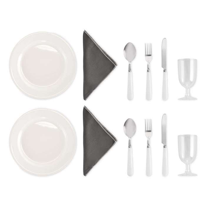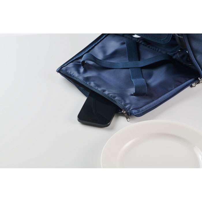 Picknickkylväska i 600D RPET-polyester för 2 personer med blixtlåsförsedd framficka inklusive bestick i rostfritt stål, 2 tallrikar i PS, 2 glas i PS och 2 bomullsservetter. Volym: 18L