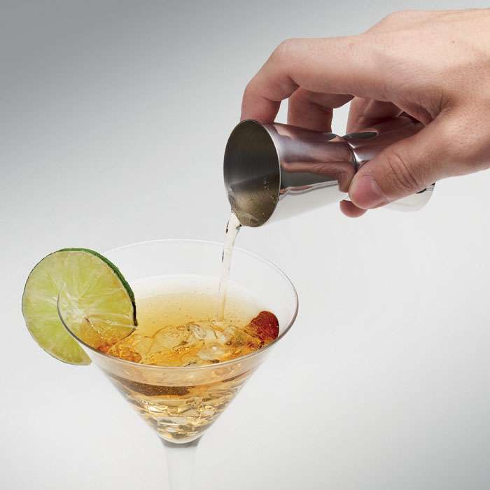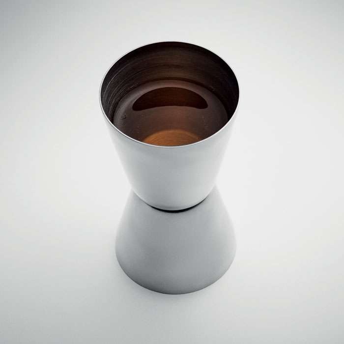 Dubbelsidigt drinkmått i rostfritt stål. Volym: 25 och 40 ml.