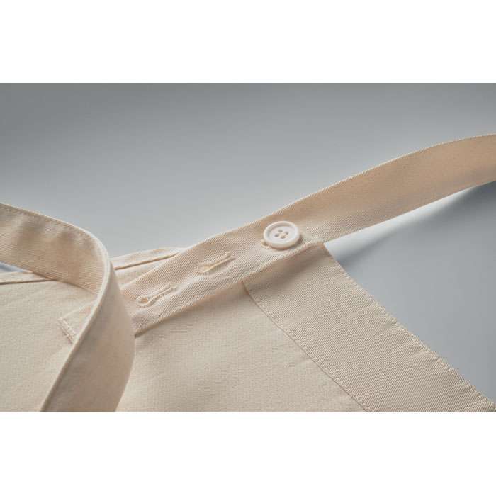 Justerbart förkläde med 1 stor framficka med 2 fack i 240 gr/m² ekologisk bomull. Med justerbar knapp på halsremmen. Denna produkt är certifierad enligt OEKO-TEX® STANDARD 100.