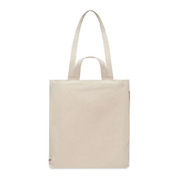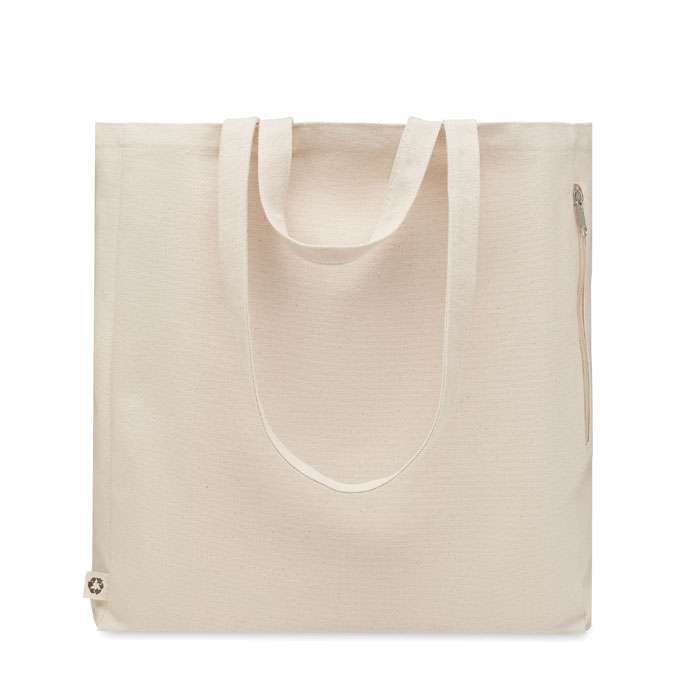 Kasse- eller strandväska i återvunnen polycotton (70% återvunnen bomull, 30% återvunnen polyester) med korta och långa handtag. Den har en sidoficka med dragkedja. 380 gr/m².
