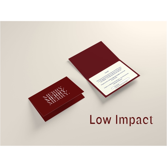 Low Impact-kortet är ett ansvarsfullt val för dig som vill ge bort en gåva med lägre miljöpåverkan. Våra produkter är noggrant designade och utvalda med hänsyn till ansvarsfulla inköp. Vi använder återvunnet material eller material certifierade av globalt erkända organisationer. Ett noga utvalt sortiment på cirka 60st val.