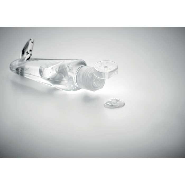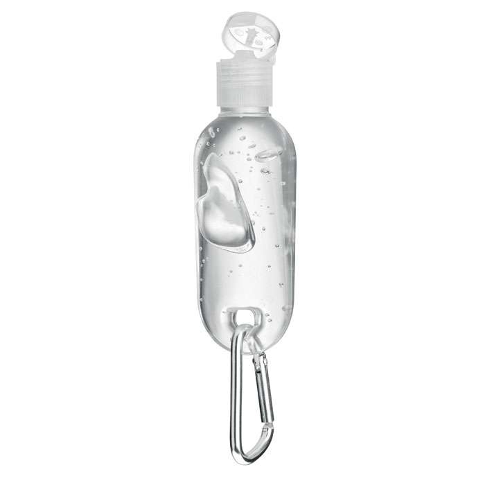 Handrengöringsgel i återfyllningsbar PET- flaska med vipplock och karbinhake. Icke-alkoholformulering. Kapacitet 30 ml.