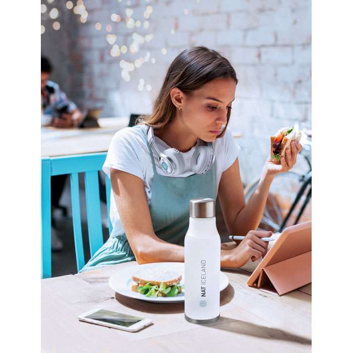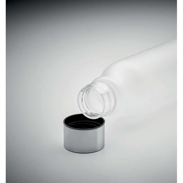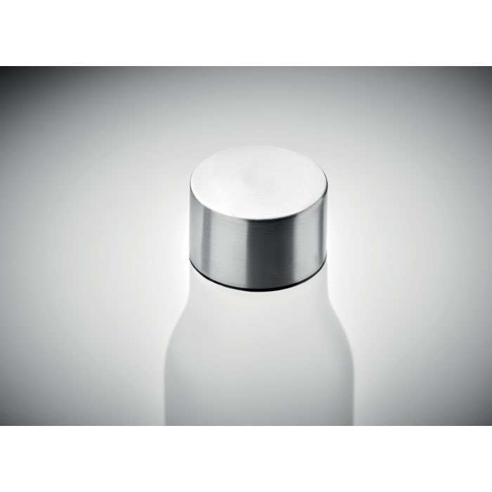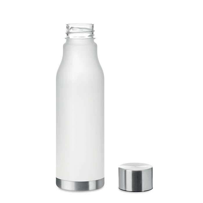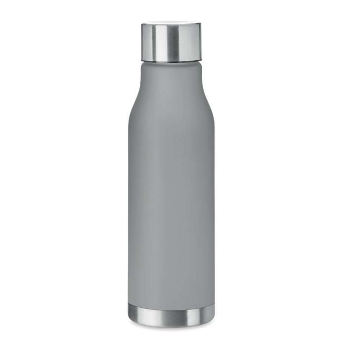 Flaska i RPET med gummierad yta och lock av rostfritt stål med inre RPET-lock och silikonring. Fri från BPA. Läckagefritt . Kapacitet: 600 ml. Ej anpassad för drycker med kolsyraLäckagefritt.