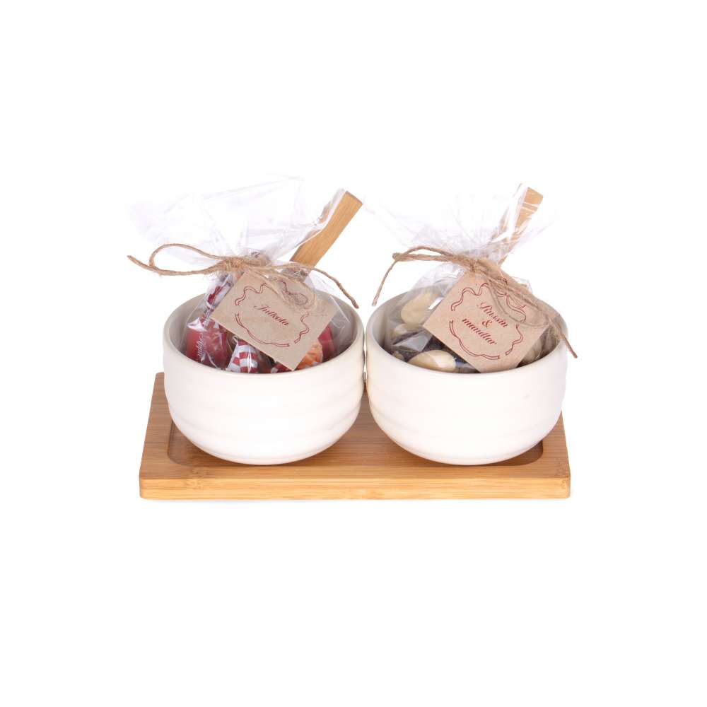 Vackra glöggskålar i keramik med tillhörande träfat och