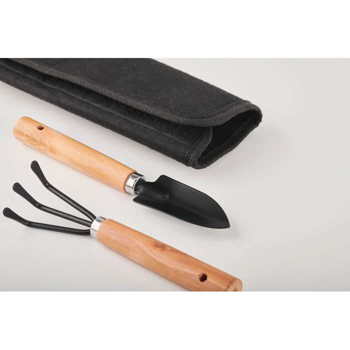 Set med 3 trädgårdsredskap. Harv och 2 spadar. Presenteras i RPET filtpåse.