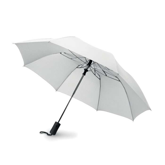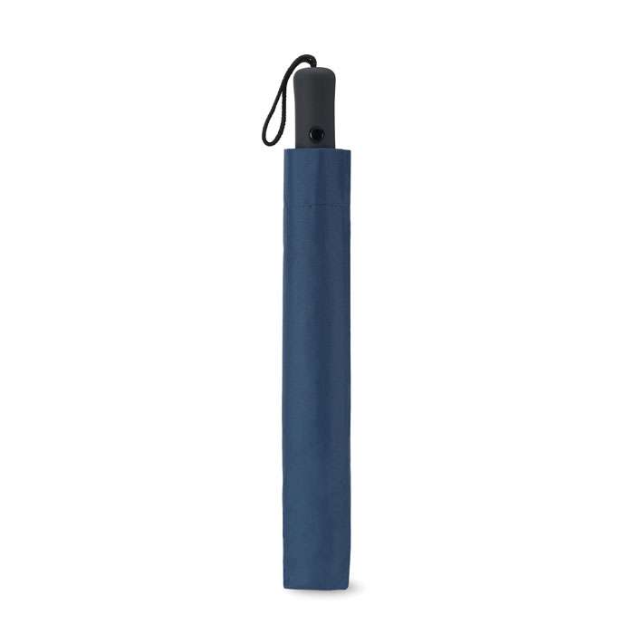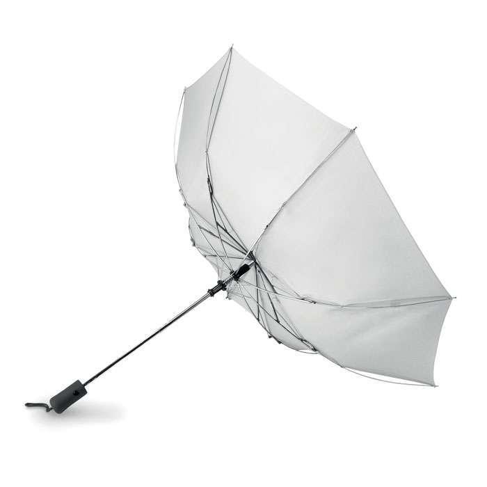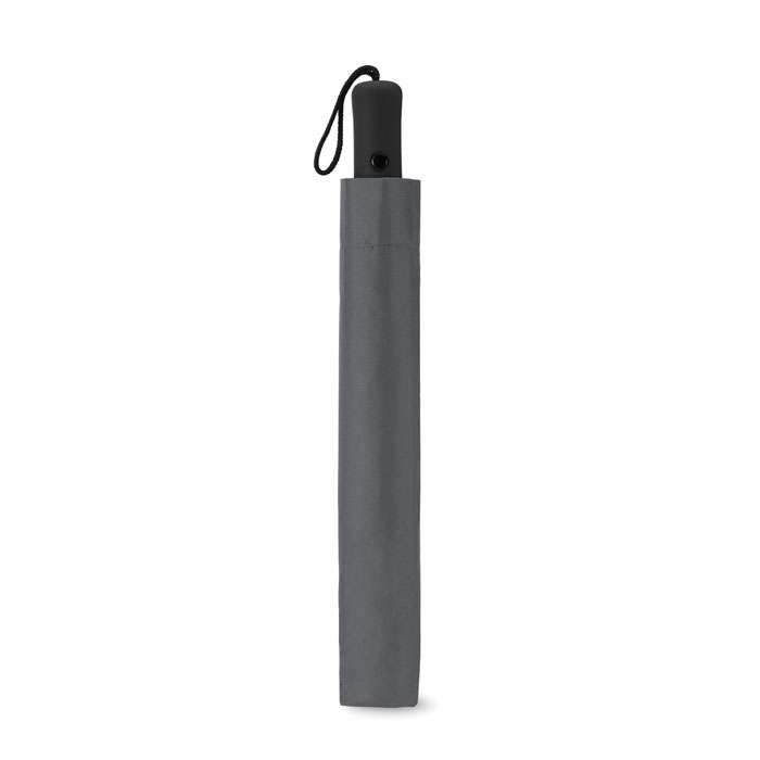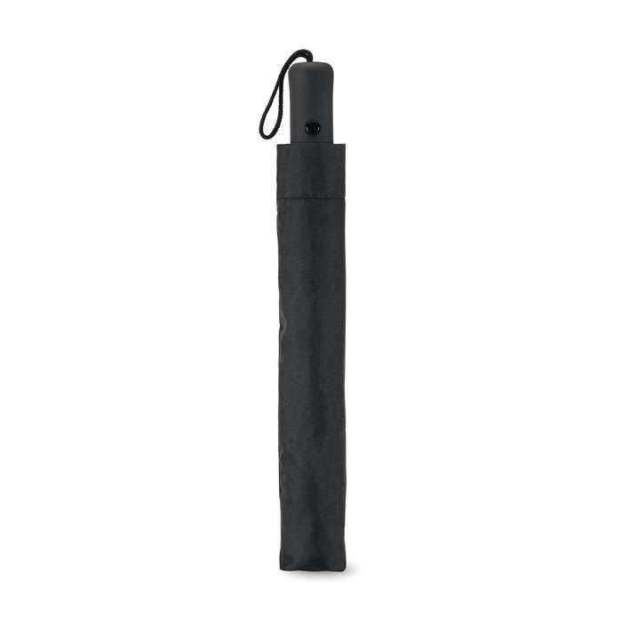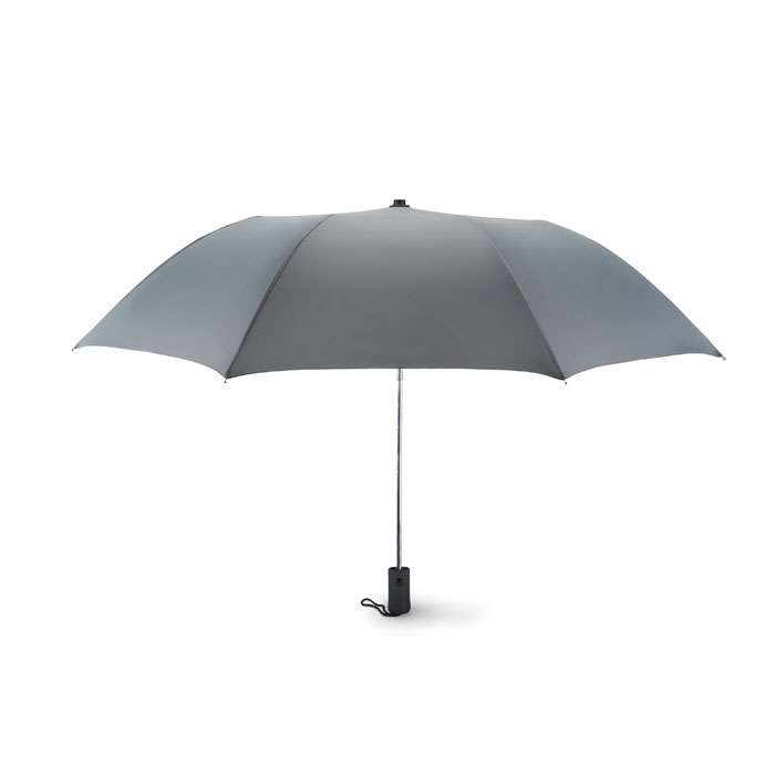 Sektionsparaply 21 tum i exklusivt 190T pongee material med pläterat stålskaft, spröt och spets. Svart gummerat handtag i ABS. Viks ihop i två sektioner. Manuell stängning och automatisk öppning. Inkluderar matchande påse.