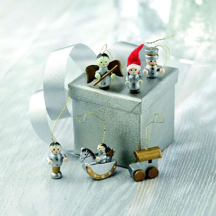 6 olika julgransdekorationer i trä som är förpackade i en presentkartong med transparent lock.