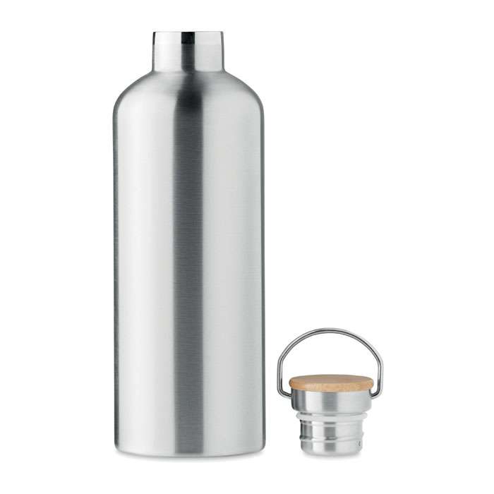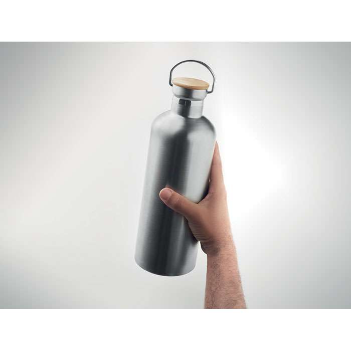 Dubbelväggig isolerande vakuumflaska i rostfritt stål för varma eller kalla drycker med lock i bambu och bärhandtag. Kapacitet: 1500 ml. Läcksäker.