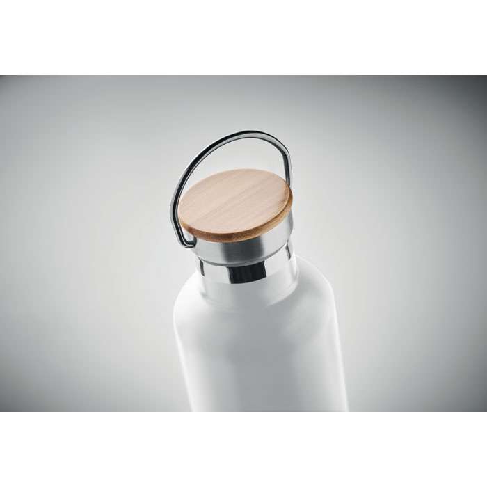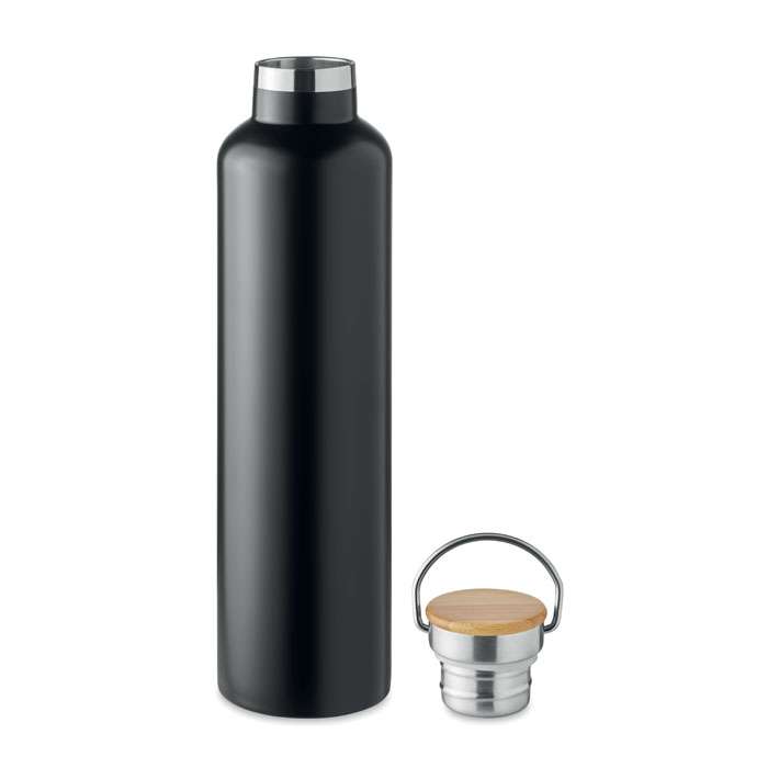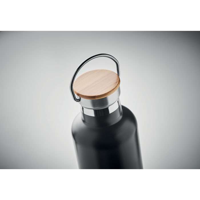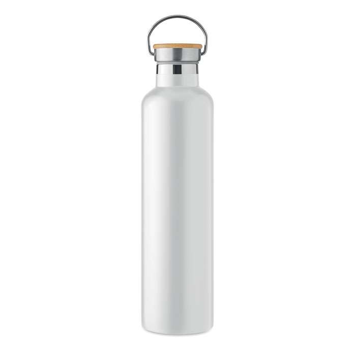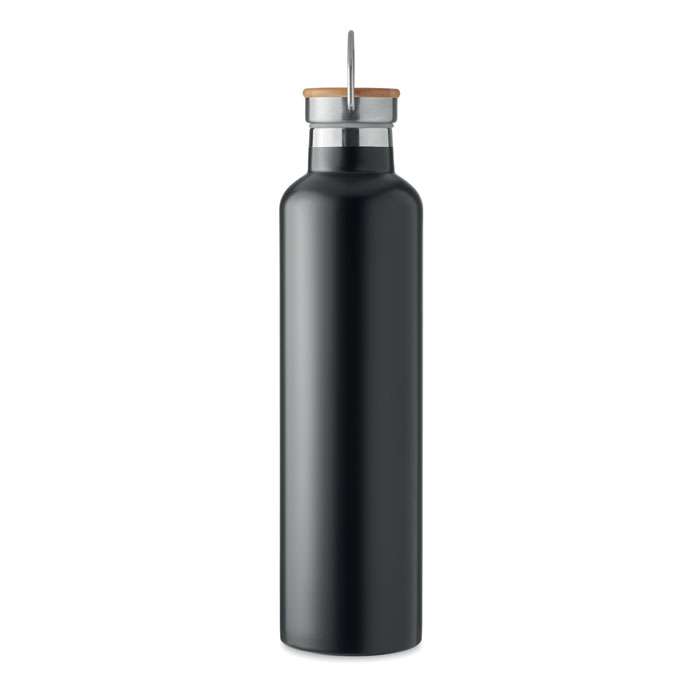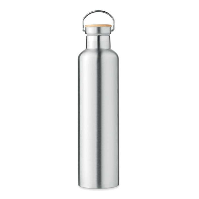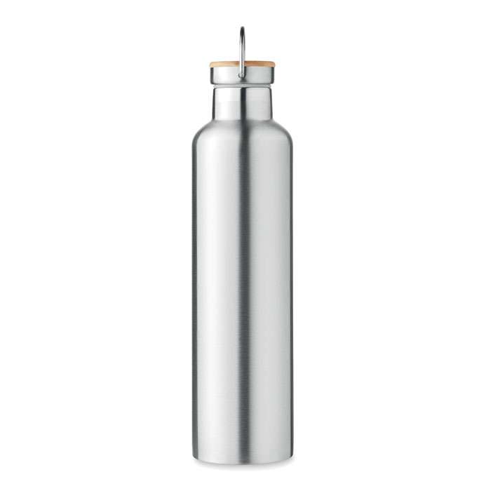 Isolerande vakuumflaska i rostfritt stål med lock i bambu och bärögla. Passar för både varma och kalla drycker. Volym: 1L. Tål diskmaskin (lock handdisk).