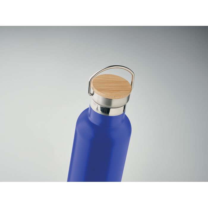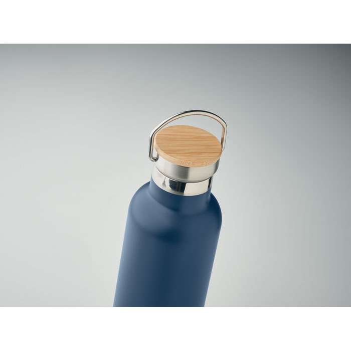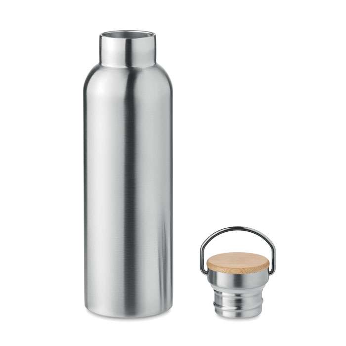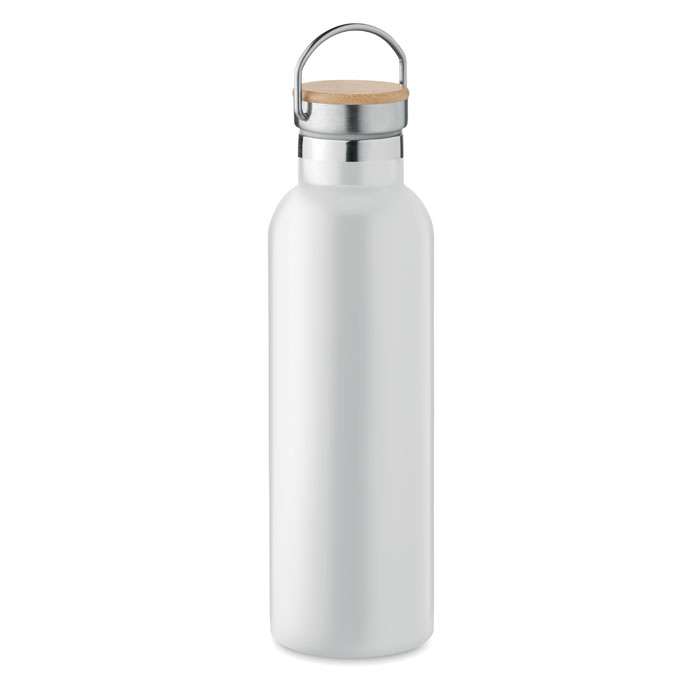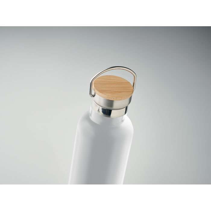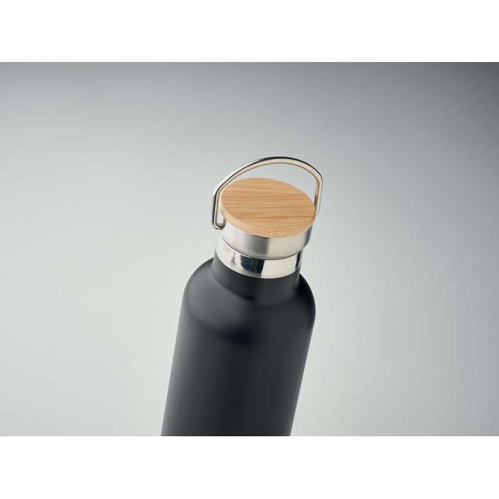 Isolerande vakuumflaska i rostfritt stål med lock i bambu och bärögla. Passar för både varma och kalla drycker. Volym: 750ml. Tål diskmaskin (lock handdisk). Läcker inte.