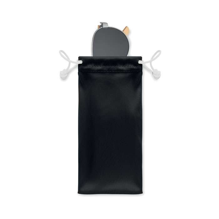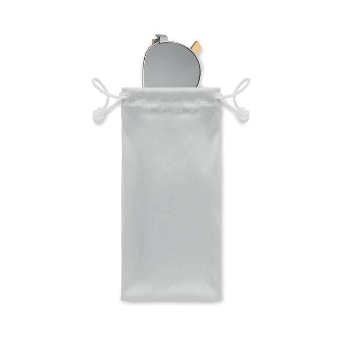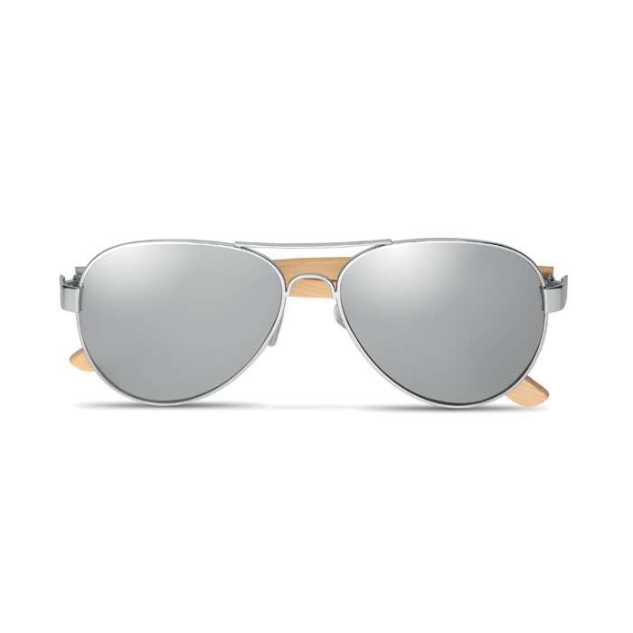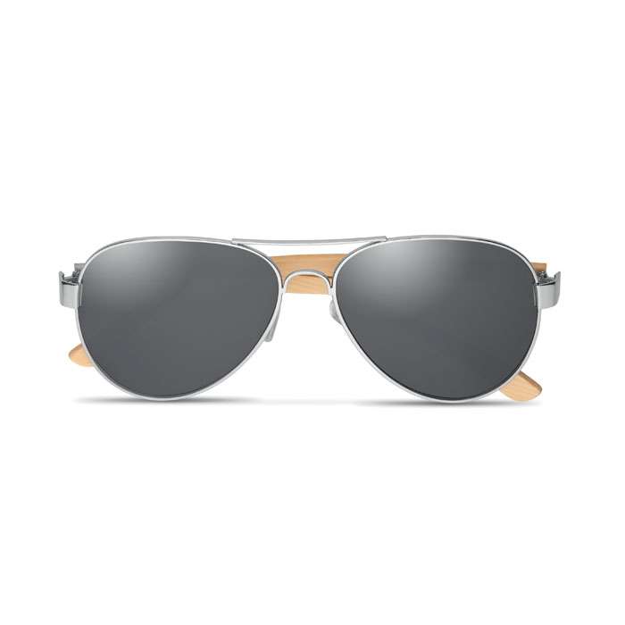 Solglasögon med bambuskalmar och färgade spegellinser i mikrofiberpåse. UV400-skydd.