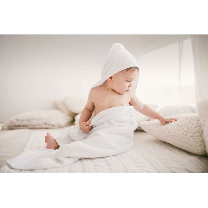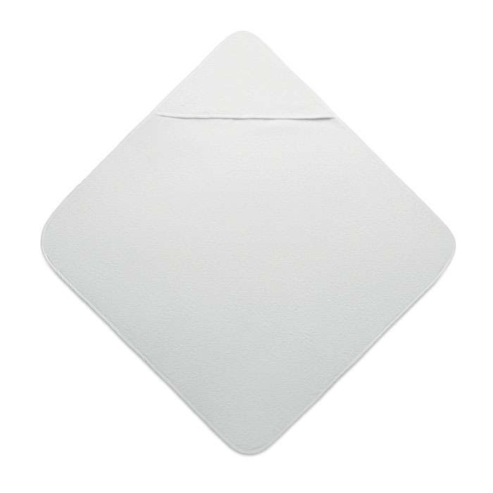Babyhandduk med huva i bomull. 300 gr/m². Denna produkt är certifierad enligt OEKO-TEX® STANDARD 100.
