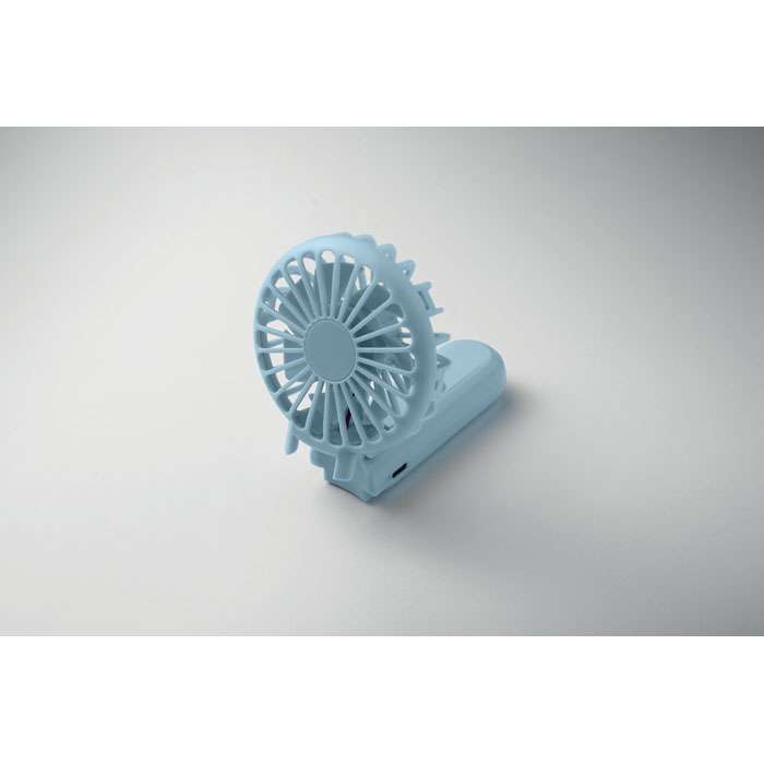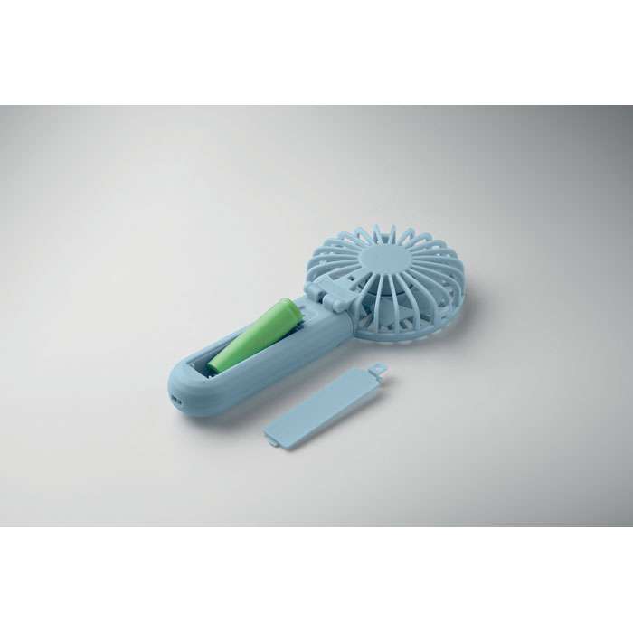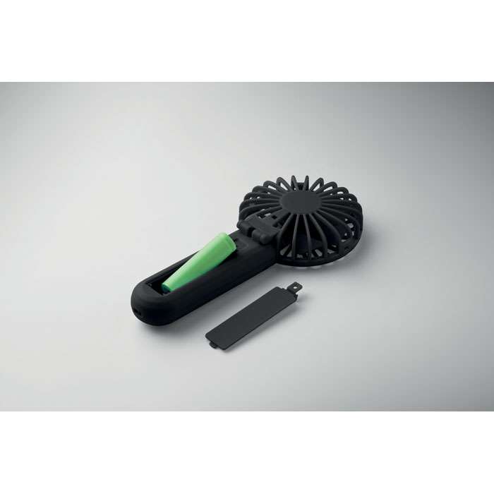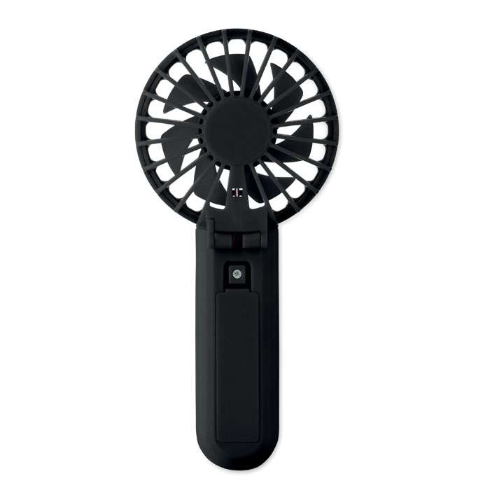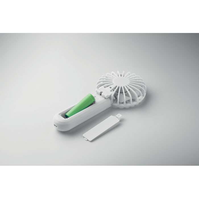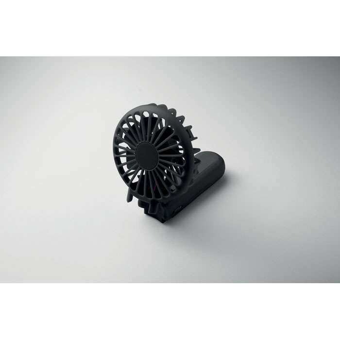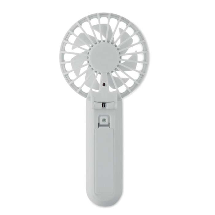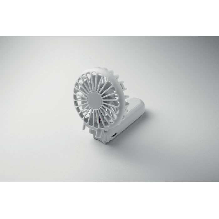 Bärbar, hopfällbar fläkt i ABS med 3 hastighetsinställningar. Kan användas som handhållen fläkt eller bordsfläkt. Inklusive 1 utbytbart och uppladdningsbart 14500 litiumbatteri på 500 mAh.