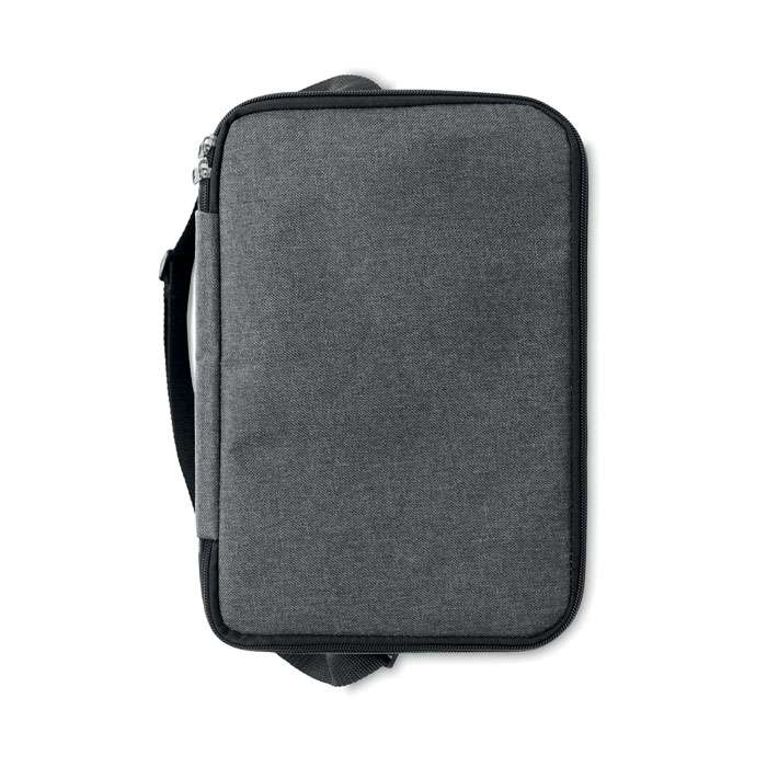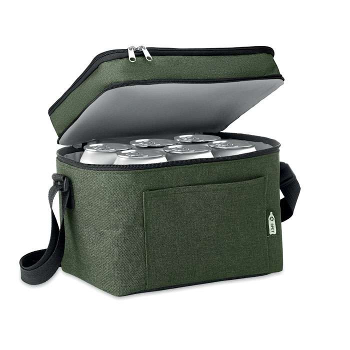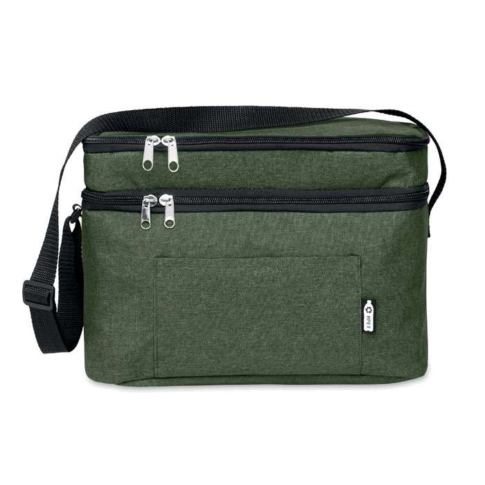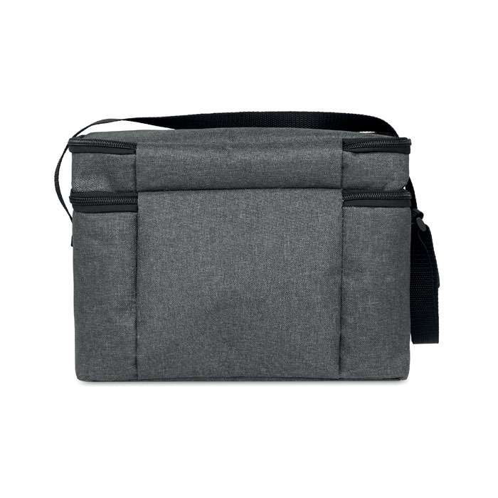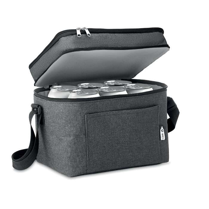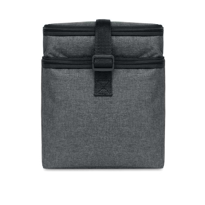 2-färgad kylväska i 600D RPET och PEVA fodrad. 2 fack, en frontficka och justerbar axelband.