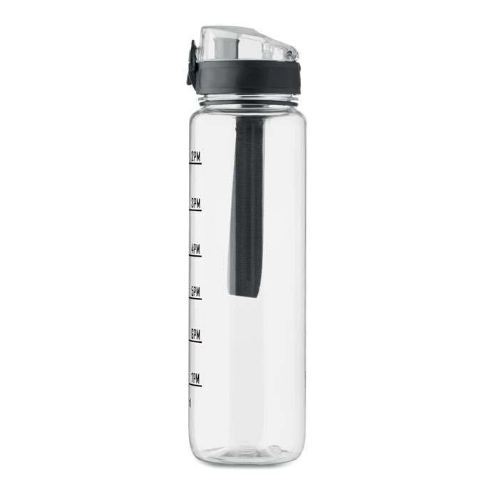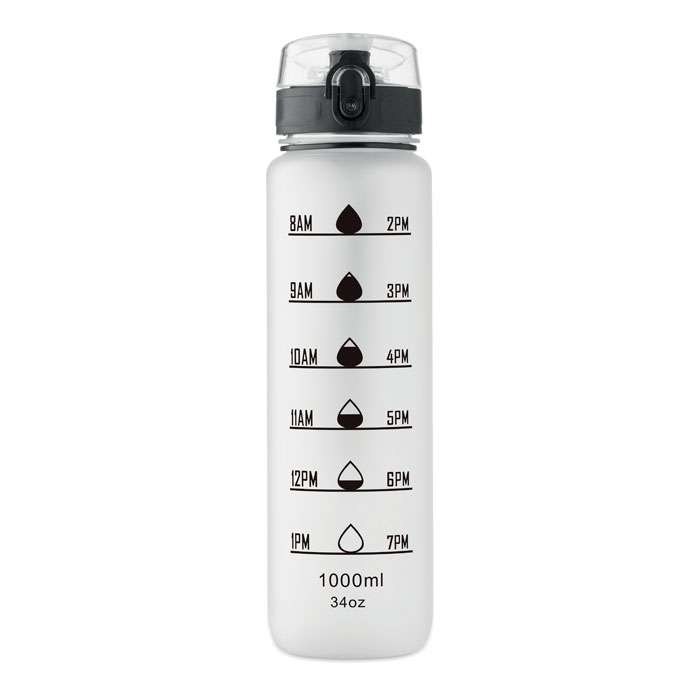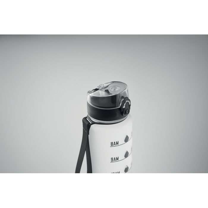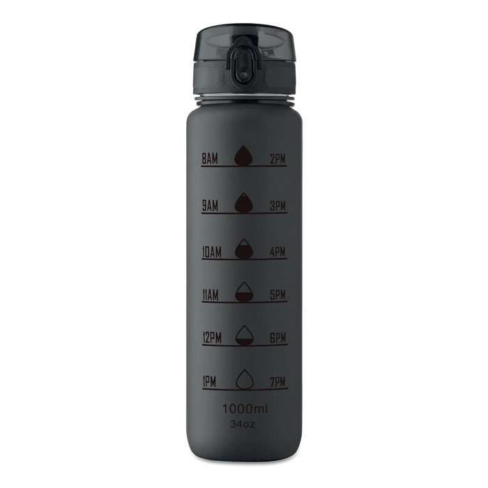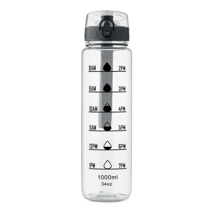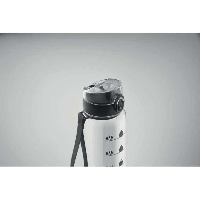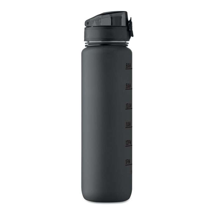 Sportvattenflaska i RPET med tidsmarkeringar, flip lock som kan öppnas med en hand, säkerhetslås och bärrem. Läckagefri. Volym: 1L.