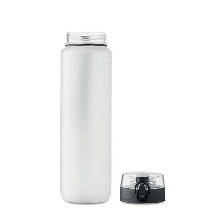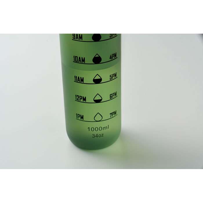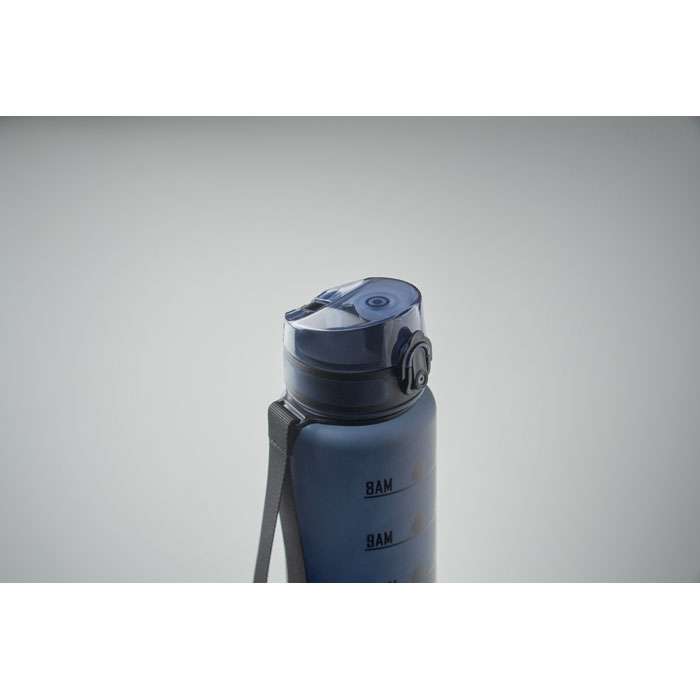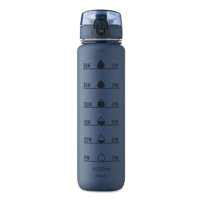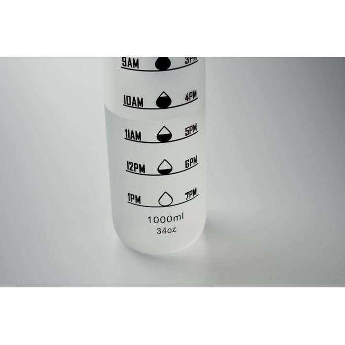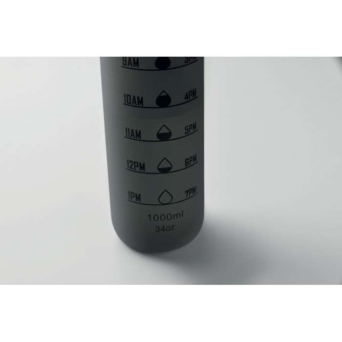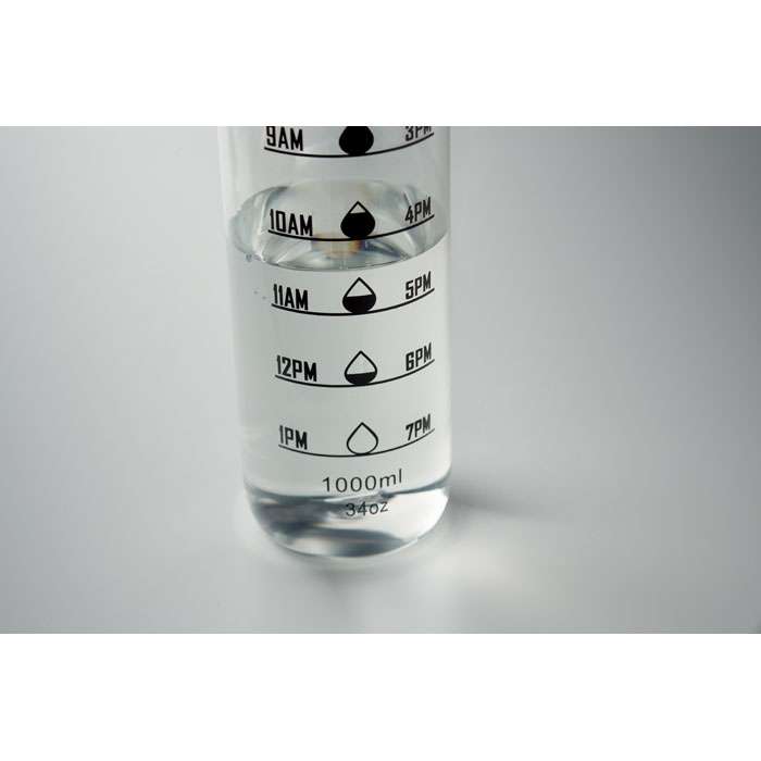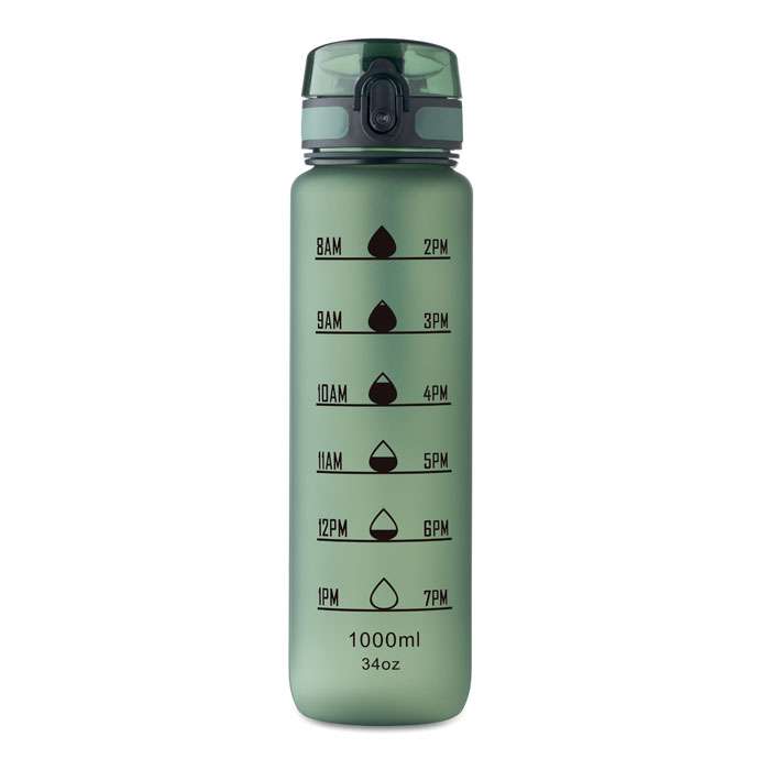 Sportvattenflaska i RPET med tidsmarkeringar, flip lock som kan öppnas med en hand, säkerhetslås och bärrem. Läckagefri. Volym: 1L.