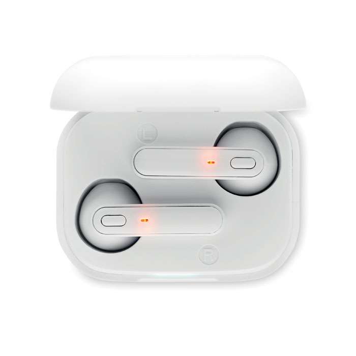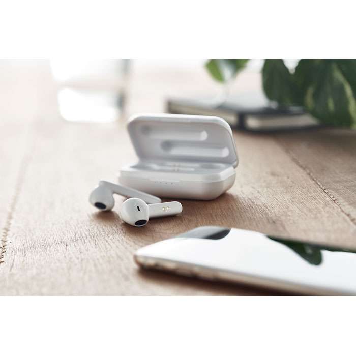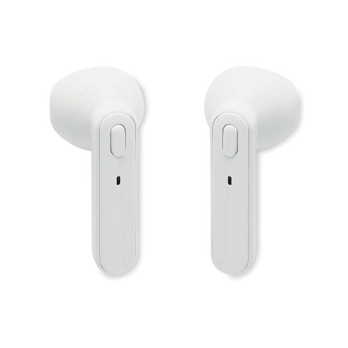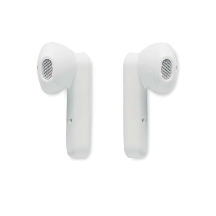 Set med 2 True Wireless Stereo (TWS) 5.3 öronsnäckor med mikrofon och inbyggt 30 mAh-batteri. Speltid ca 3 timmar. Automatisk parning. Inkluderar en mikro-USB-laddningskabel och en 185 mAh-laddningsstation. Tillverkad av återvunnen ABS.