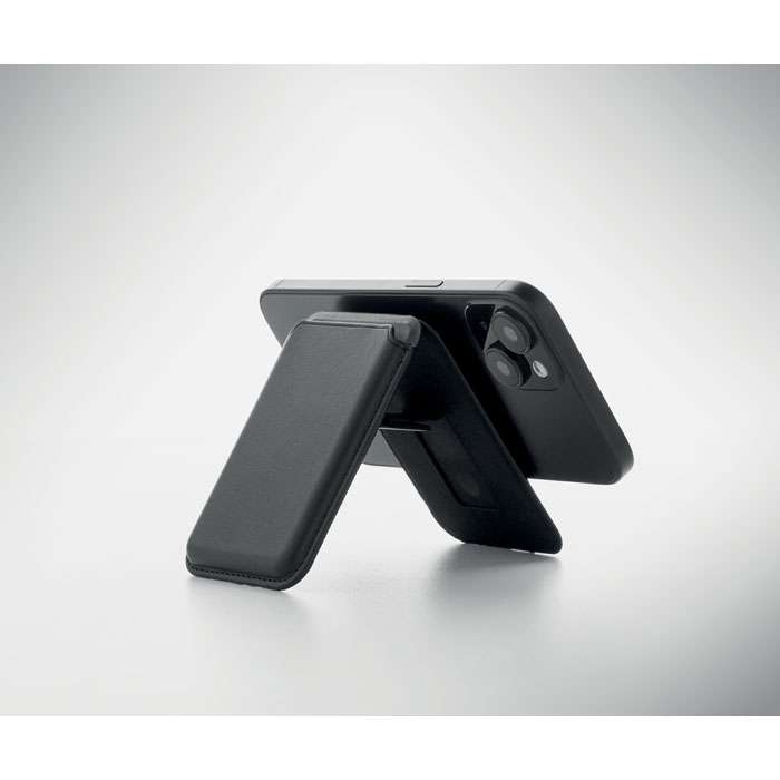Magnetisk kreditkortshållare (för 3 kort) i PU-läder med mobilstativsfunktion. Den innehåller en extra metallring.