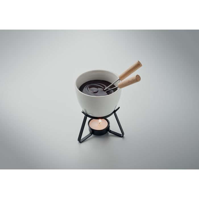 Litet keramiskt fondueset för två. Inklusive två metallgafflar med trähandtag. Värmeljus ingår ej. Volym: 240 ml.