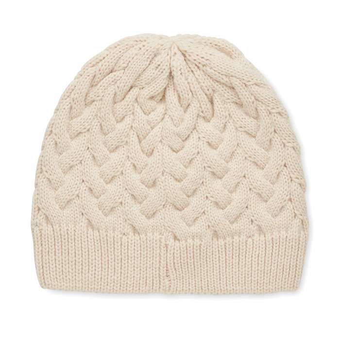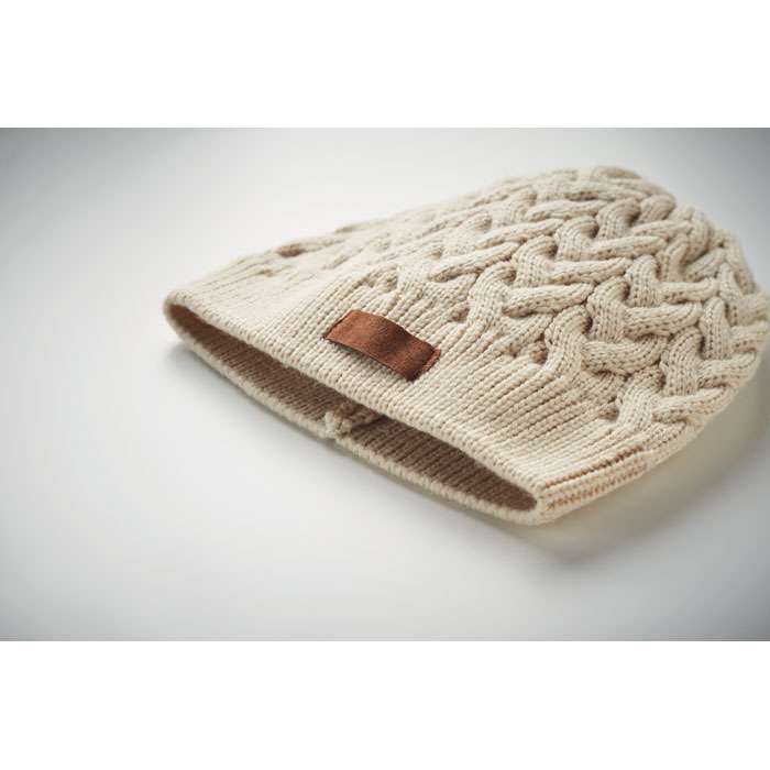Kabelstickad mössa i RPET med etikett för märkning.