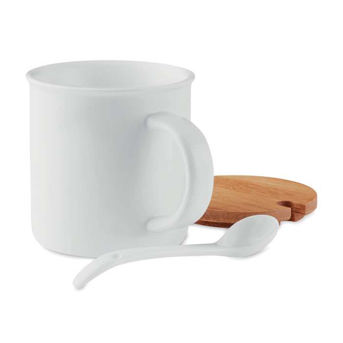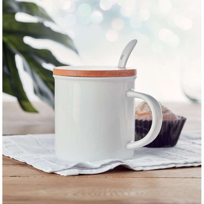 Kaffemugg i porslin med bambu lock. Levereras i presentkartong. Volym 38 cl.