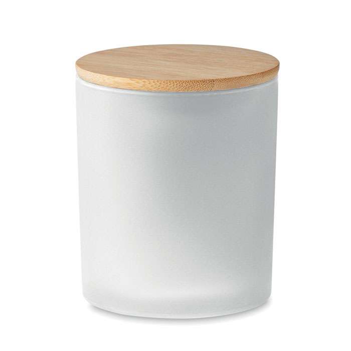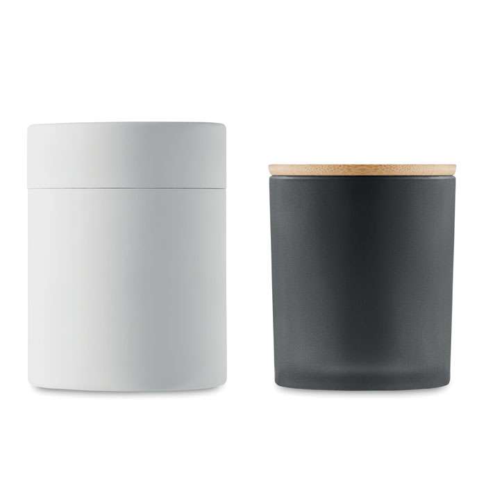 Kanel-, vanilj-, sandelträ- eller jasmindoftande växtbaserat kvalitets vaxljus i en glasburk i frostat glas med bambulock. 280 gr. Brinntid: 46 timmar. Levereras i en presentförpackning med pappersrör.