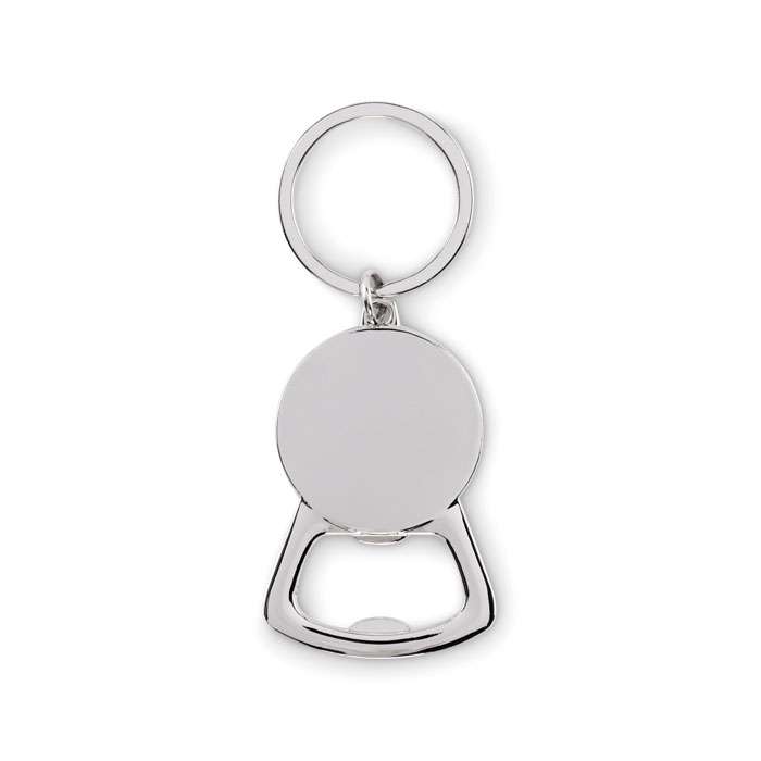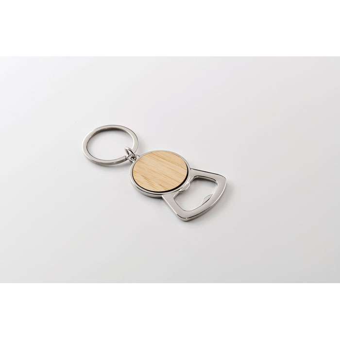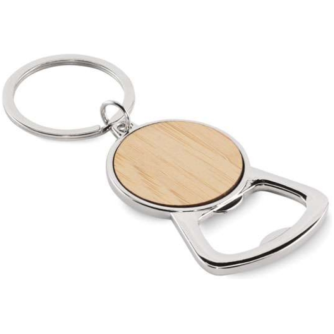 Nyckelring med flasköppnare i metall med bambu-detaljer.