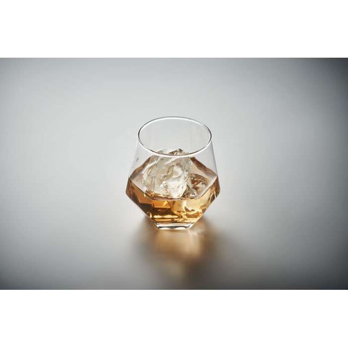Geometriskt diamantformat lutande whiskeyglas. Volym: 300 ml.