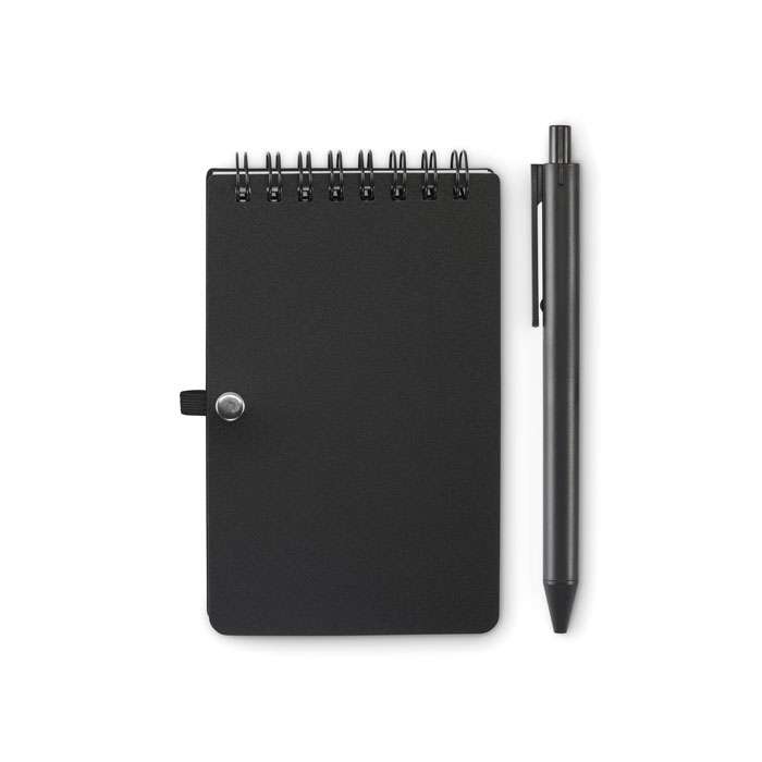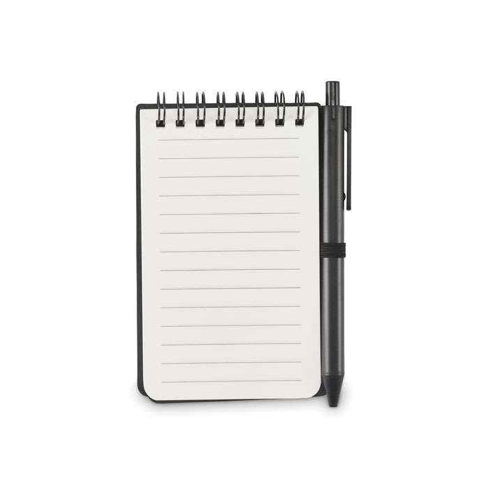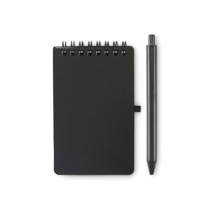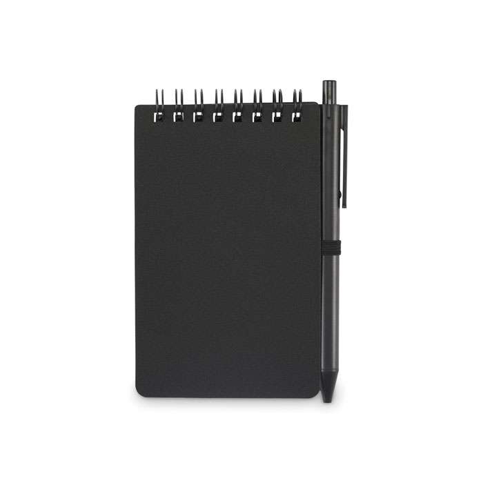 Anteckningsblock i fickformat i PP-omslag med vattenavsidande sidor och penna. Dubbeltrådig. Mineralpapper 120 gr/m², 50 ark linjerade. Blått bläck. Elastisk förslutningsrem och pennhållare.