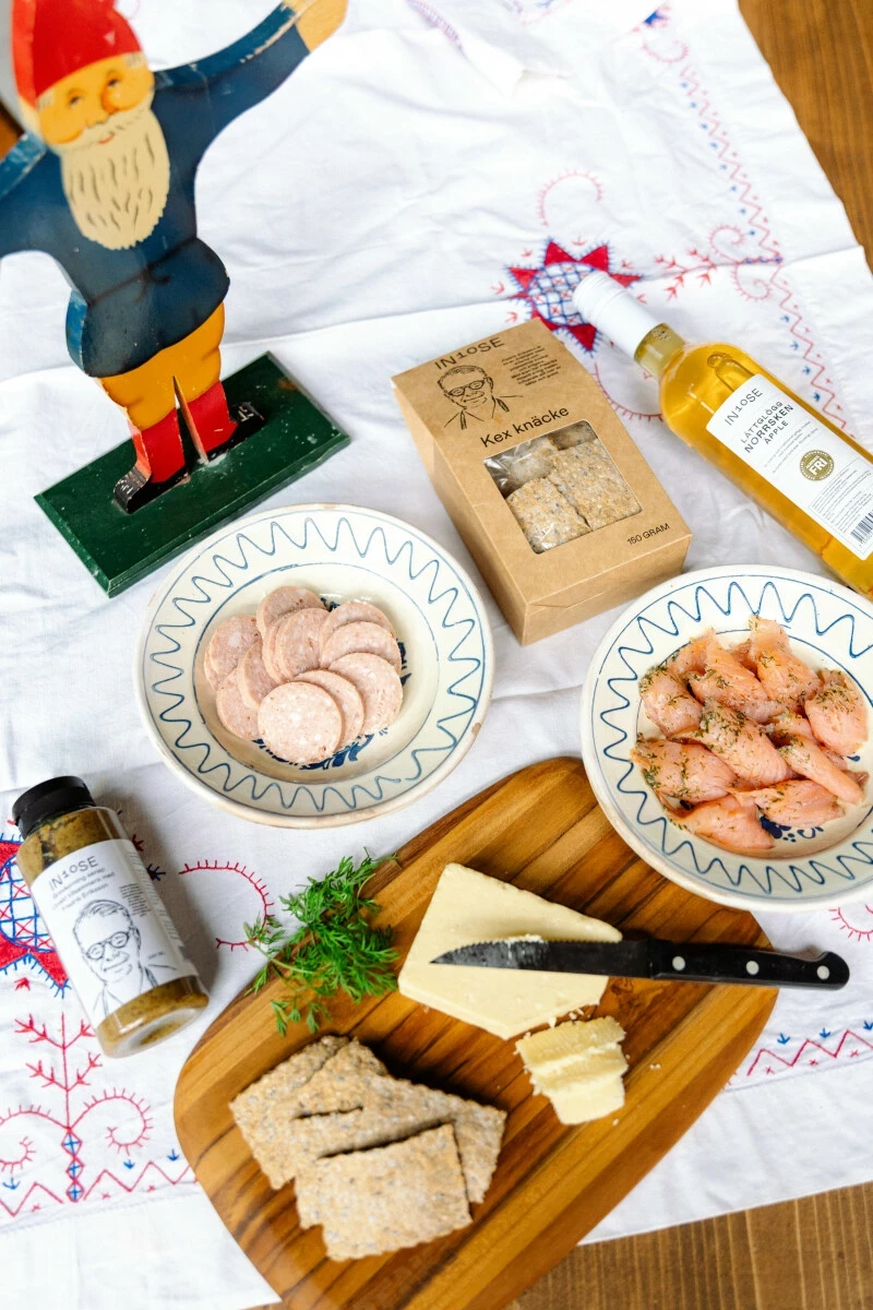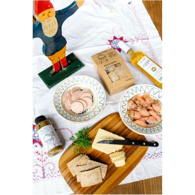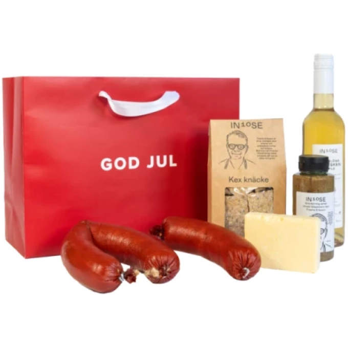 Vad är julen utan klassiska inslag som glögg, korv, ost, knäcke och senap? Ungefär som en jul utan tomten eller Kalle Anka. I denna härliga påse med fin God Julhälsning på utsidan hittar du allt detta. Grovkornig senap från Småland tillsammans med frisk äppelglögg gjord på äpplen som också dom kommer från Småland. Skär upp en härlig bit Barbers lagrade cheddar eller skiva upp lite rökt korv eller julmedwurst och lägg på det goda kexknäcket framtaget tillsammans med stjärnkocken Fredrik Eriksson. Vad mer kan man begära? Setet innehåller: -1st Presentpåse i rött med vita satin snören och God Julhälsning på utsidan. -1st Äppelglögg 50cl. -1st förpackning med kexknäcke 150g framtagna med kocken Fredrik Eriksson. -1st Grovkornig senap framtagen med kocken Fredrik Eriksson 265ml. -1st Julmedwurst cognac 180g. -1st Rökt julkorv 400g. -1st Barbers cheddarost 160g.