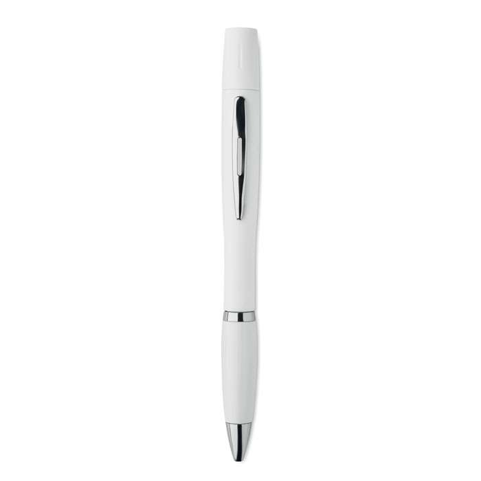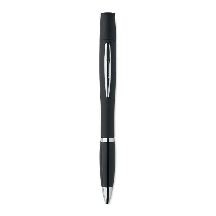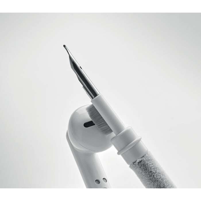 Penna med TWS rengöringsset. Den har ett rengöringsset för True Wireless Stereo (TWS) öronsnäckor: metallspets, svamp och borste. Blått bläck.