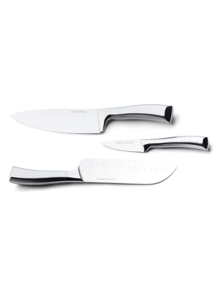 Knivset av stål bestående av skalkniv, kockkniv och en santokukniv.