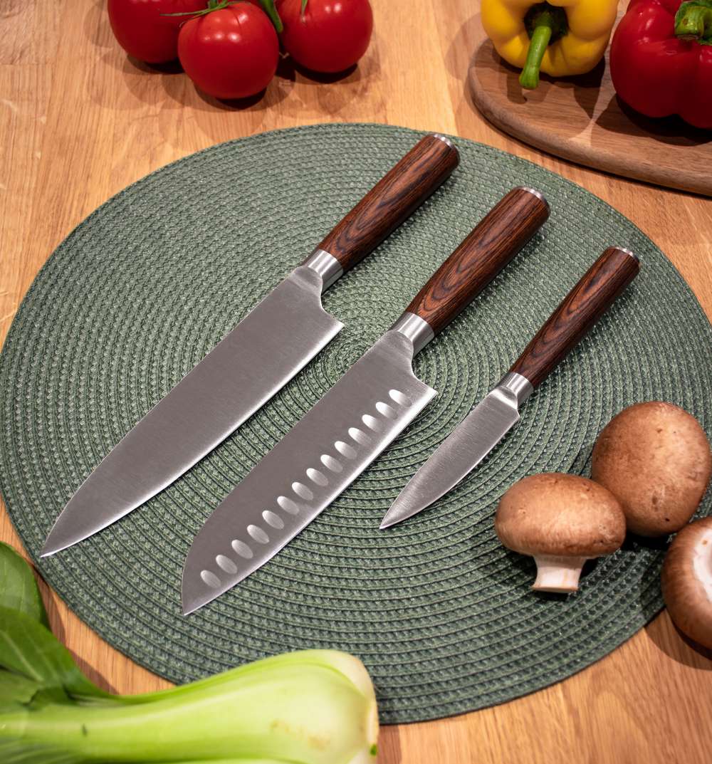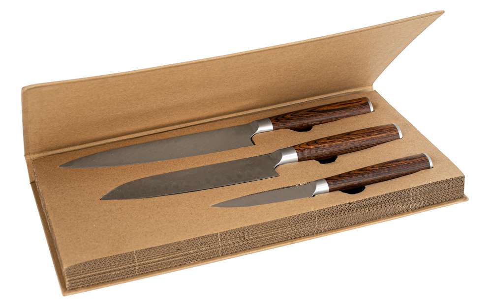 Set med tre vackra och funktionella köksknivar. Kockkniv på 19cm, Santokukniv på 16,5cm samt en skalkniv på 9cm. Blad i 5Cr15MoV stål och handtag i underhållsfri Pakka wood. Levereras i miljövänlig förpackning.