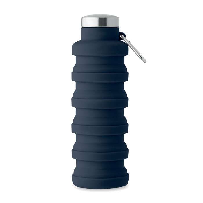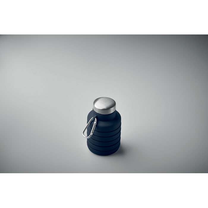 Hopfällbar silikonflaska med lock i rostfritt stål och karbinhake i aluminium. Karbinhaken är inte avsedd för klättring (icke-professionell användning). Volym: 500 ml.